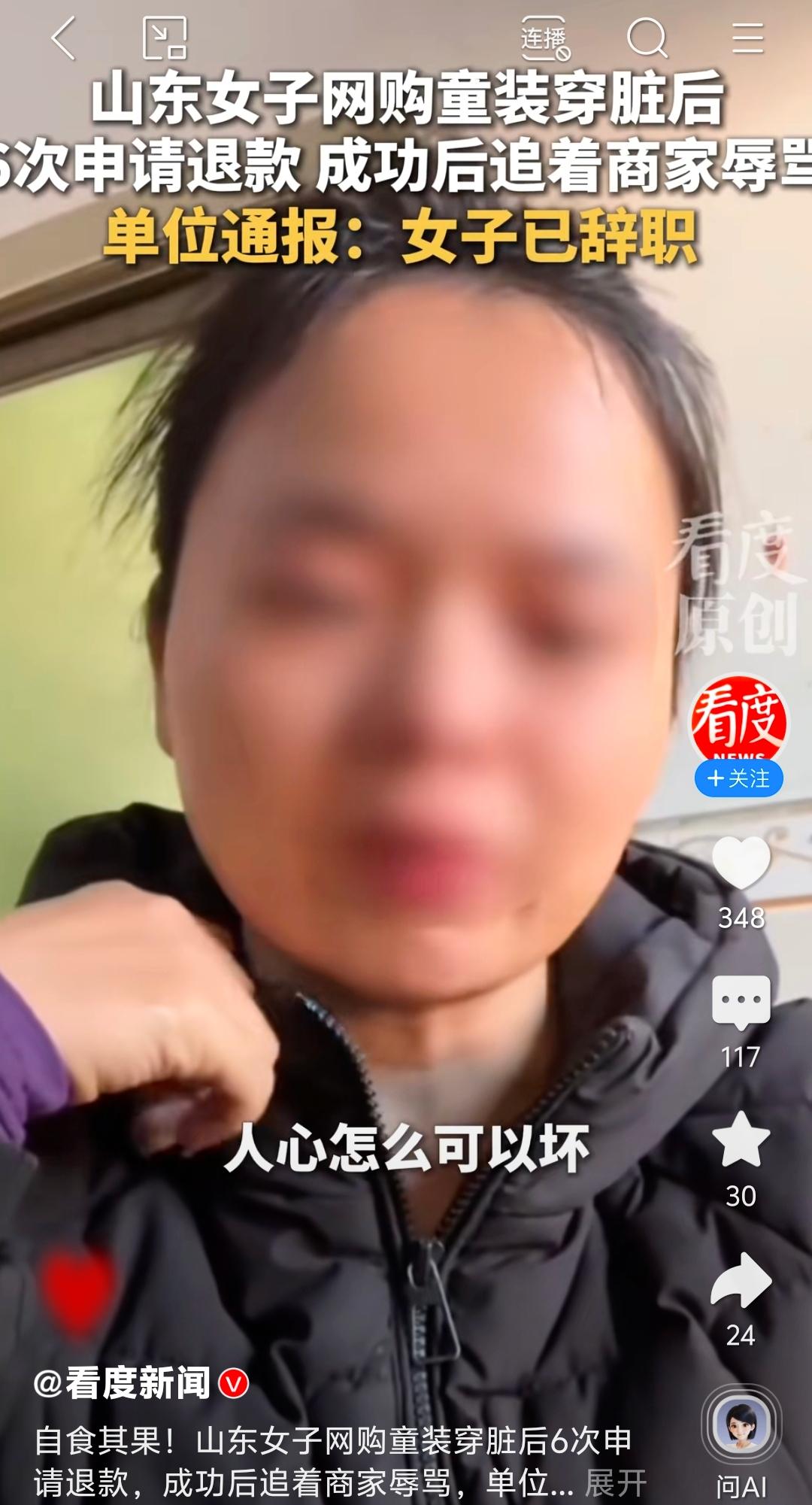 穿脏童装退款还辱骂商家,山东女子被曝光后辞职! 山东惠民县王某网购童装,竟将穿脏的90码旧衣调包成新购110码申请退款,遭拒后6次申请平台介入,借系统超时成功退款,还恶毒辱骂商家甚至诅咒其孩子。 事件曝光后,王某以孕期抑郁道歉仍遭网友质疑敷衍,其单位火速通报,同意其辞职并解除劳动关系。 网友怒斥:道德底线不能丢,职业身份更不是护身符!