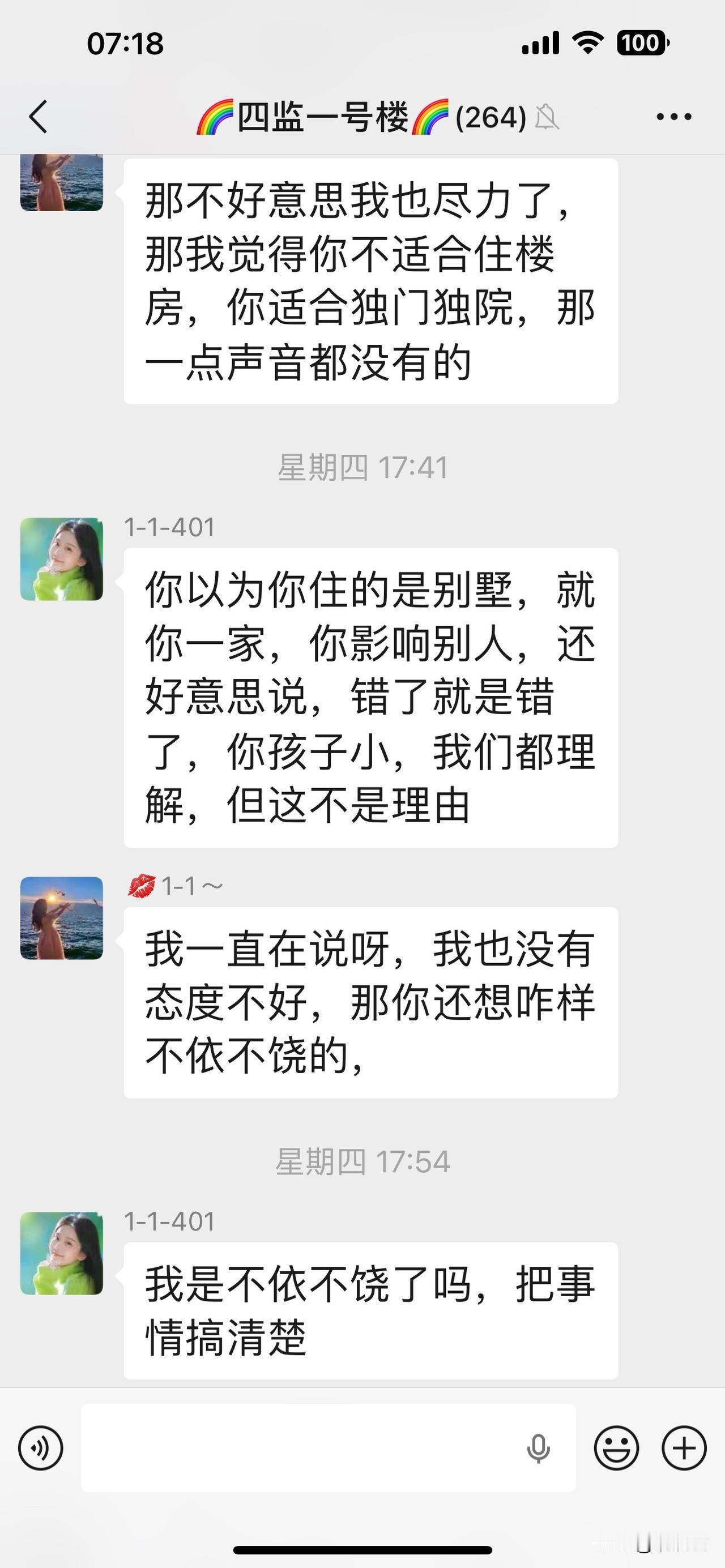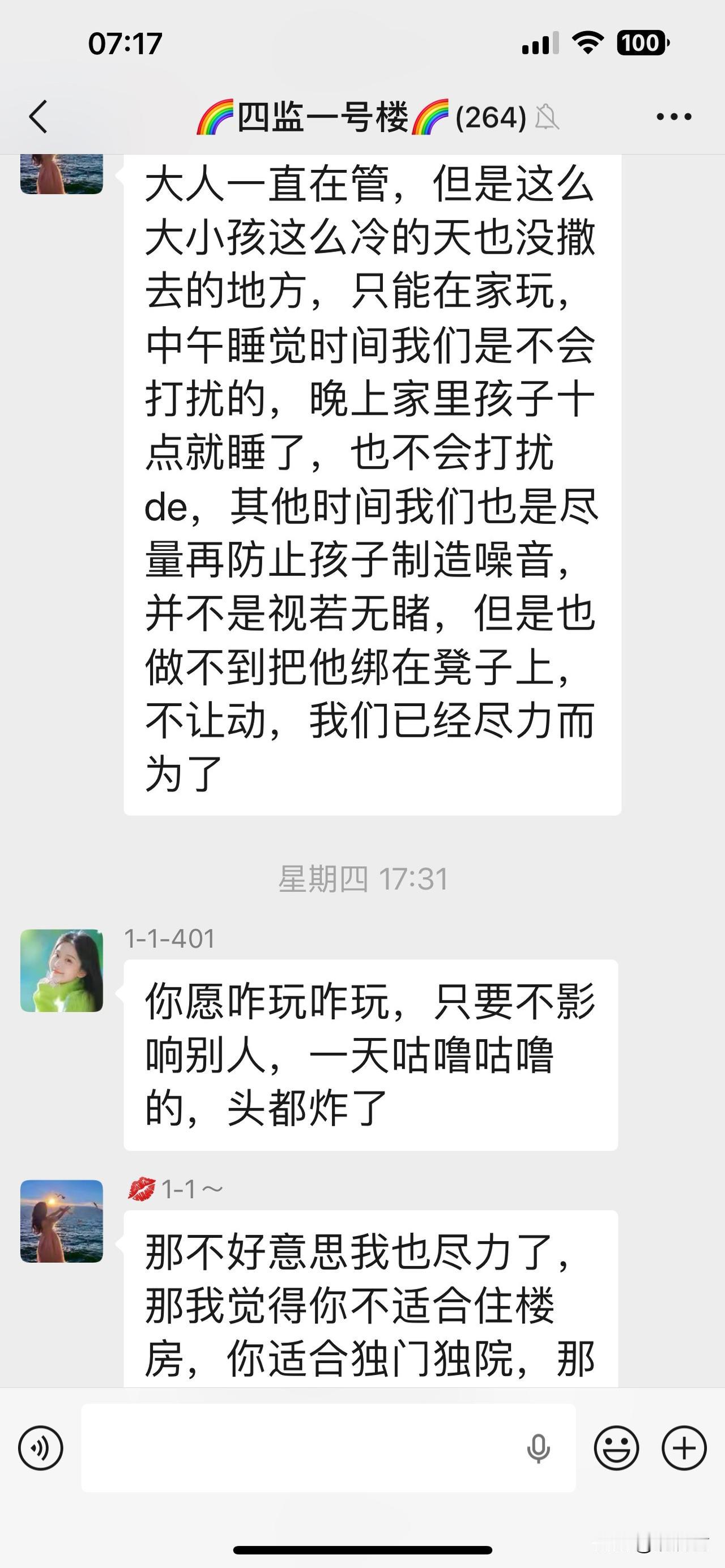 住楼房的家庭,常常因为噪音的问题影响到邻居们的心情。 都说远亲不如近邻,因为家里发出的噪音,亲爱的邻居们又吵起来了。 上一次群里吵架是四天前,时间是凌晨一点,这一次则是下午17点。 上一次邻居们吵架是因为楼上在夜里发出的噪音惊扰到楼下,两个人在群里连夜开启了互怼模式,真实声源未知。 这一次是楼上的小孩在家里滑轮滑,被楼下录音做证据发到了群里。 一方面,小孩天性活泼好动,另一方面,有的人神经衰弱,对持续的噪音耐受性差,感到苦不堪言。 对于住楼房产生的噪音影响到邻居们的和谐相处,主要归因大概有以下几点: 一、隔音差。 楼房噪音扰民主因可能在于建筑楼板墙体单薄,隔音效果差。 二、部分住户缺乏公共意识,在家里行为不当(如滑轮,跑跳等)。 三、邻里间缺乏互相体谅,小事易积累升级为矛盾。邻居家噪音扰民