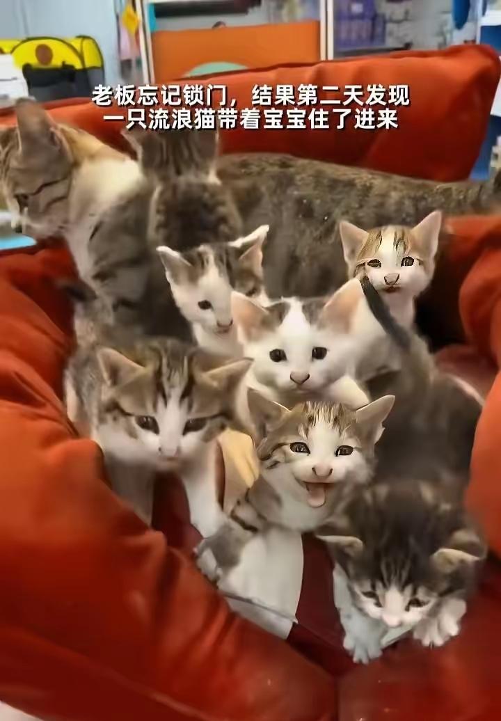 超市老板晚上忘锁门,第二天推门一看,乐了。 不是遭了贼,是他店里的长沙发上,挤着八只猫。一只大黄猫紧紧搂着七只小奶猫,团成一大团。听见开门声,大猫警觉地抬起头,小猫们睡得迷迷糊糊。 老板当时就愣在门口了。他第一反应是去看货架——整整齐齐,地上也干干净净,收银台啥也没动。只有沙发旁边,不知从哪叼来了些碎纸絮,垫成了个小窝的样子。他心里一下就明白了,这估计是外面流浪的猫妈妈,昨晚带着娃,瞅见他门没关严实,钻进来找个暖和地方过夜了。 老板没吱声,轻轻退出去,假装没看见。过了一小时再回来,那一家子还窝在那儿,估计是冻坏了,睡得沉。他这才走近了看,猫妈妈瘦得肋骨一根根的,毛也不光亮,粘着草籽,但把小猫护得严严实实。小猫们也就巴掌大,眼睛都没全睁开,挤在一起微微起伏。 他没养过猫,但看着这场面,手就软了。转身从货架上拿了罐鱼肉罐头,打开放在离沙发好几米远的地上。猫妈妈闻见味儿,耳朵动了动,抬头看看他,又看看罐头,没动。它眼神里有警惕,也有点怯生生的。 老板也没催,自己该干嘛干嘛,收拾店面。到了中午,太阳正好照进店里,那片沙发区域暖洋洋的。他又找了个结实的旧纸箱,垫了件不穿的旧毛衣,轻轻放在墙角。然后把那罐鱼肉和水碗,挪到了纸箱旁边。 这回,猫妈妈盯着他忙活,看了好久。终于,它小心翼翼地站起身,轻巧地跳下沙发。七只小崽跌跌撞撞地跟着滚下来。它带着孩子们,慢慢挪到那个新纸箱旁边,先自己进去踩了踩,觉得软和,才把小猫一只只叼进去。最后自己才缩进去,把孩子们圈好。 安置好了,它才伸出头,快速地吃了几口罐头,喝了些水。整个过程安静极了,一点没捣乱。 打那天起,这八只猫就在超市角落住下了。老板给它们准备了固定的粮碗水碗,猫妈妈也懂事,从不乱跑,小猫们大一点就在纸箱附近嬉闹。来的顾客看见了都觉得新鲜,老板就笑着解释:“忘了锁门,‘招’来的,挺乖,就养着了。” 有熟客还专门带点猫零食来。 有人说,这猫妈真会挑地方,专找心软的人。老板自己倒没想那么多,他说就是碰上了,天这么冷,你看见了,能不管么?管了,这一家子就有个活路。店里多了点生气,也挺好。 有时候,缘分和善意,来得就这么突然。一个没锁的门,一场寒冷的夜,一次不忍心,就让八条小生命的故事,彻底转向了。 看到这种流浪动物主动“求助”的故事,你心里是啥感觉?