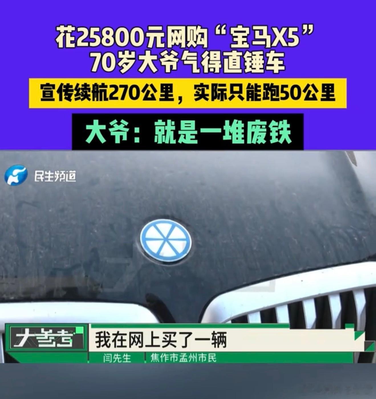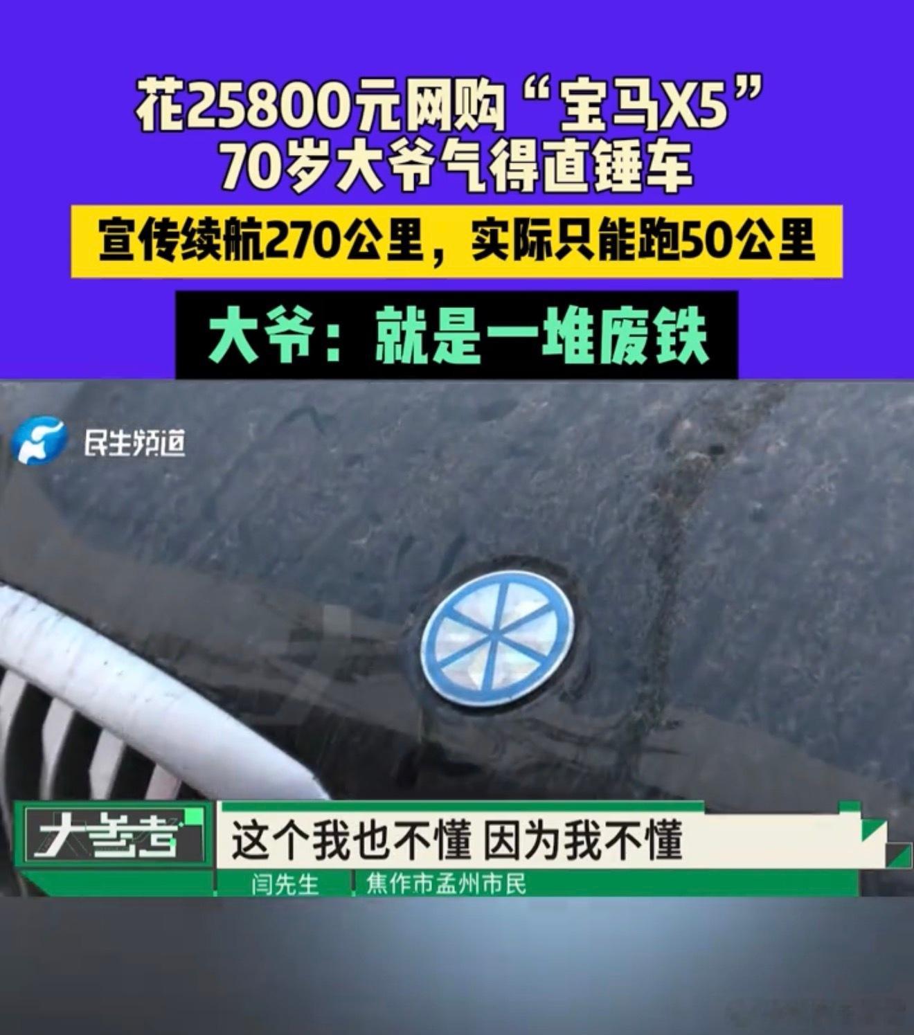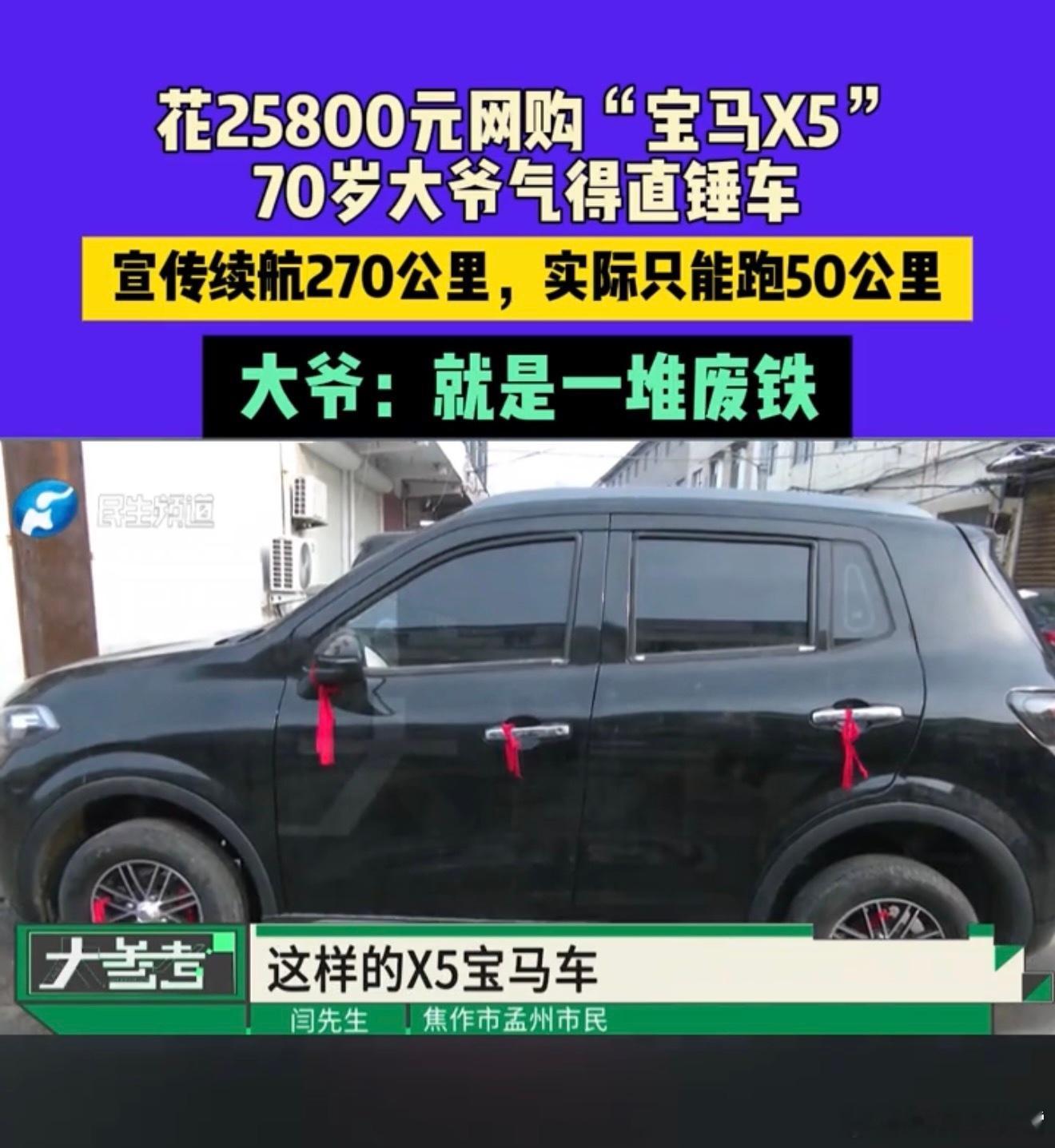 大爷2万买宝马5天趴窝4次拉断绳刚看到这话题我还寻思宝马啥车卖2万,仔细一看原来是“宝马X5”老头乐,说实话这类产品真该好好管管了。大爷花2万多买的这车,他说以为是宝马生产的电动车,到手后发现噪音大各种掉零件,标称续航270km,实际只能跑50km,现在子女老伴都不敢坐这车,你们感受下