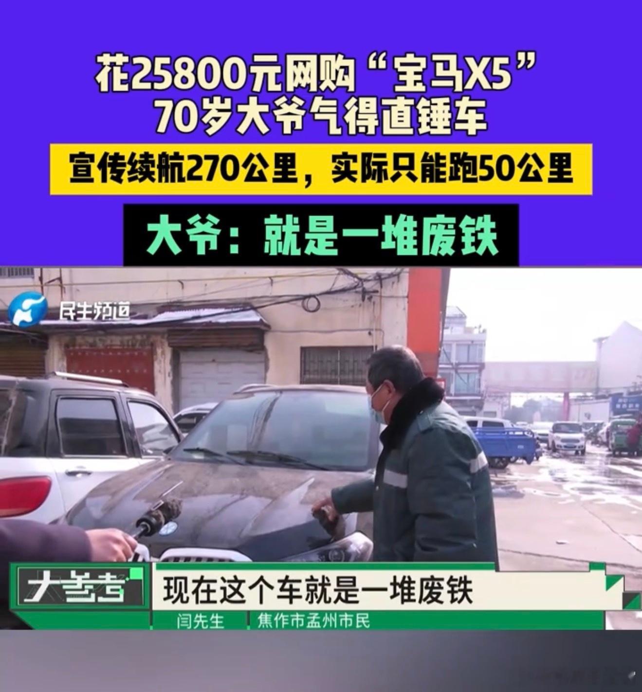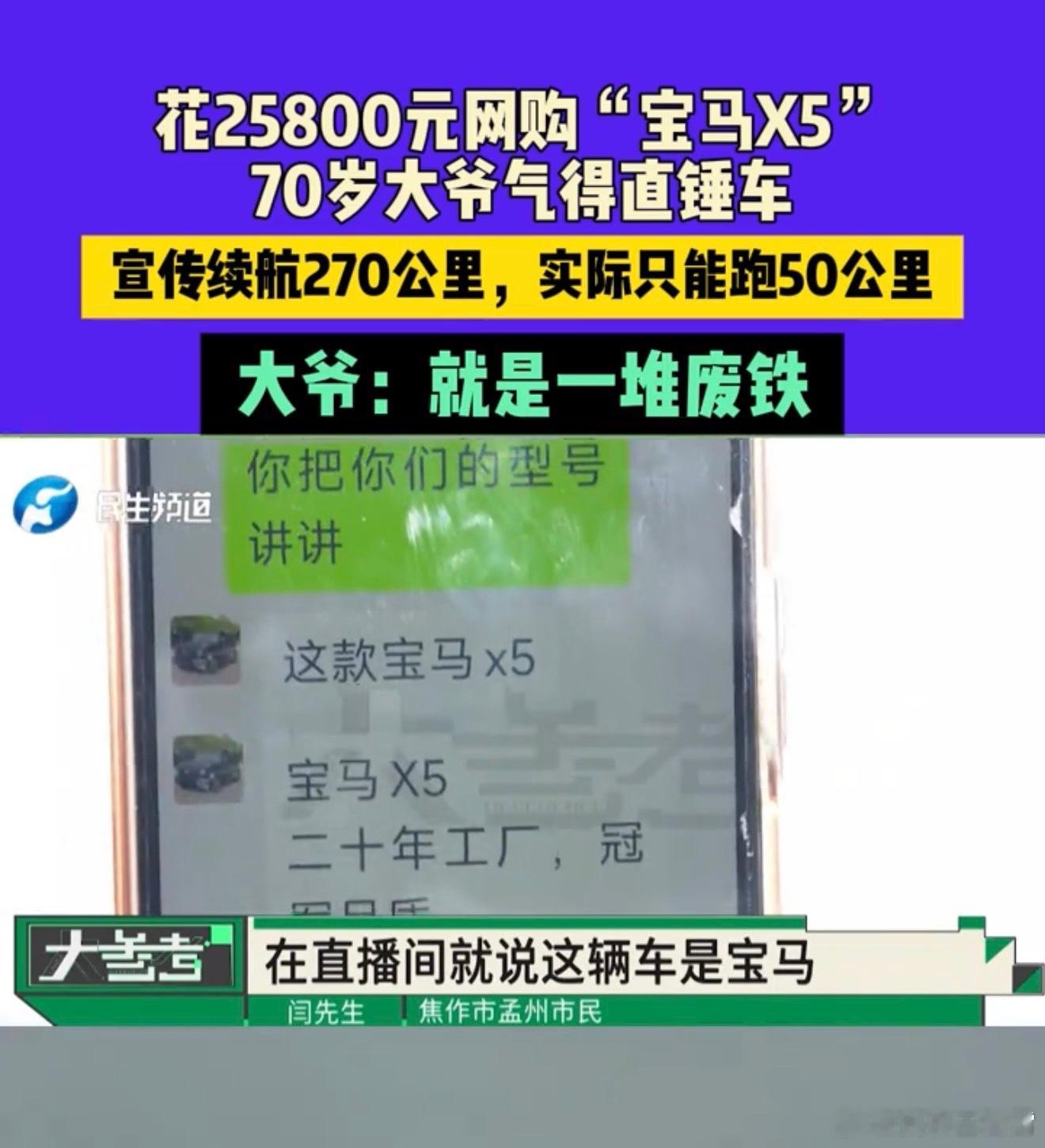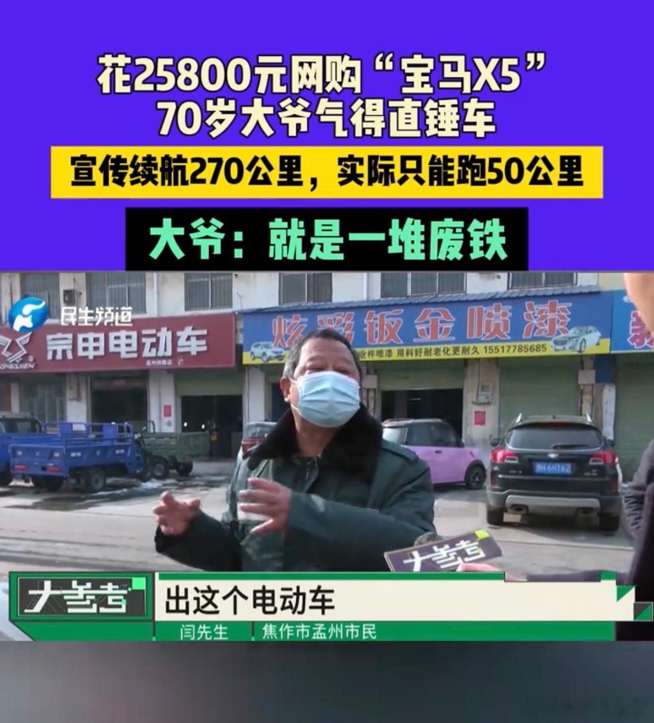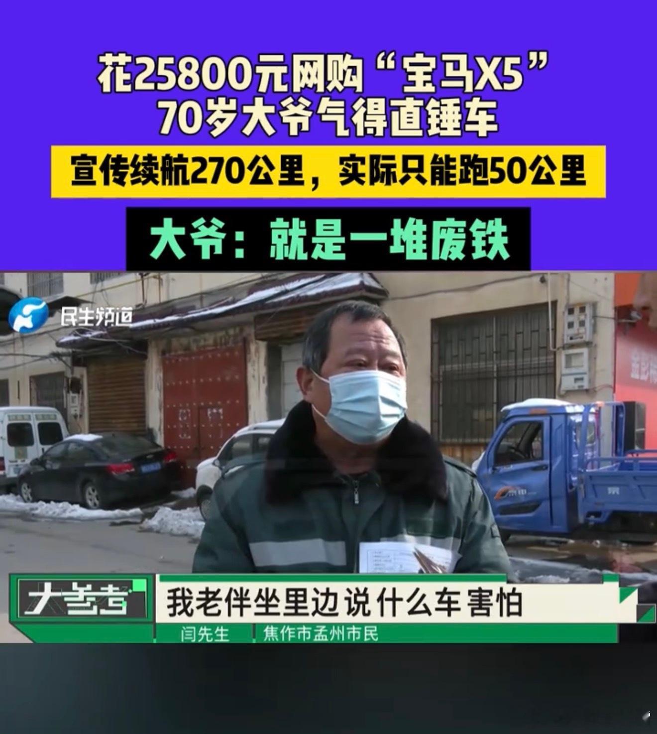 大爷2万买宝马5天趴窝4次拉断绳刚看到这话题我还寻思宝马啥车卖2万,仔细一看原来是“宝马X5”老头乐,说实话这类产品真该好好管管了。大爷花2万多买的这车,他说以为是宝马生产的电动车,到手后发现噪音大各种掉零件,标称续航270km,实际只能跑50km,现在子女老伴都不敢坐这车,你们感受下