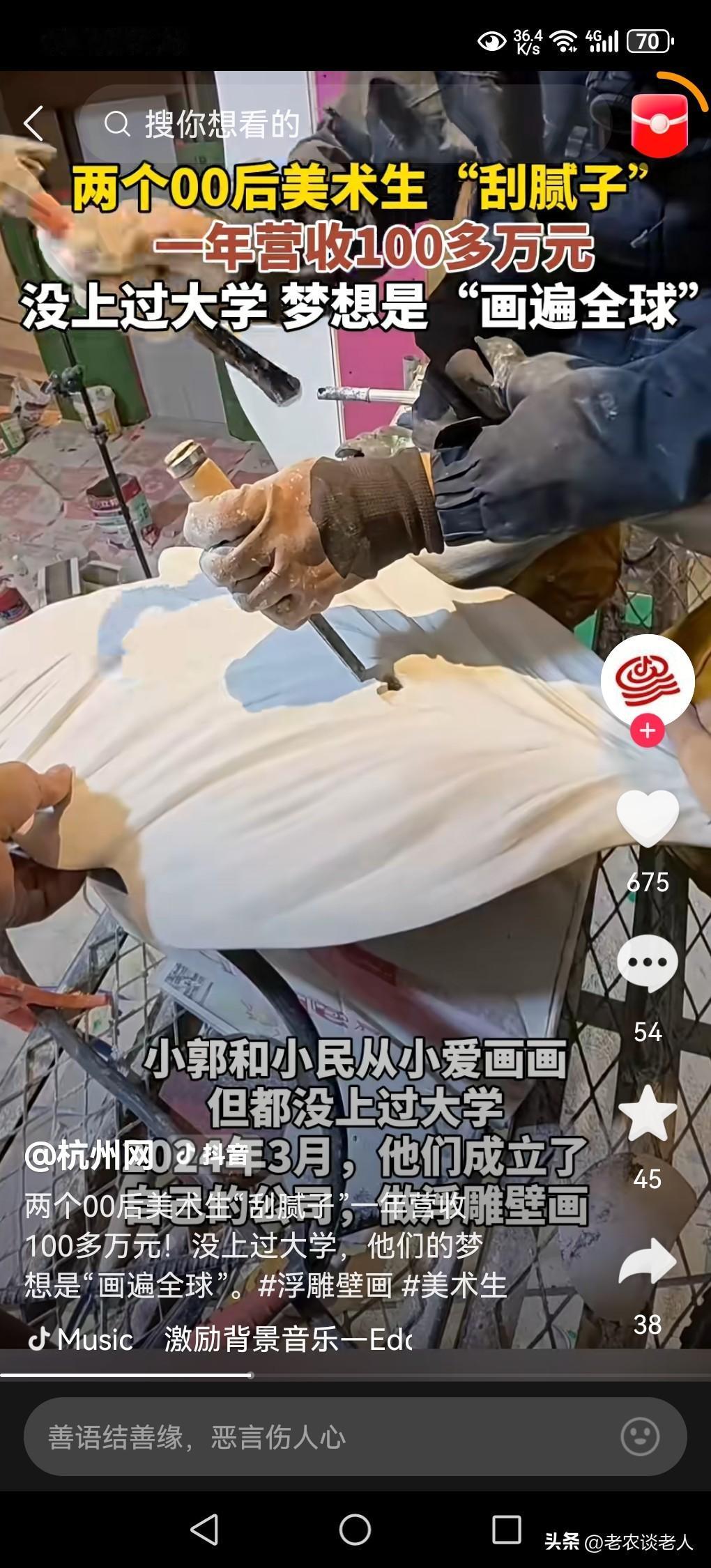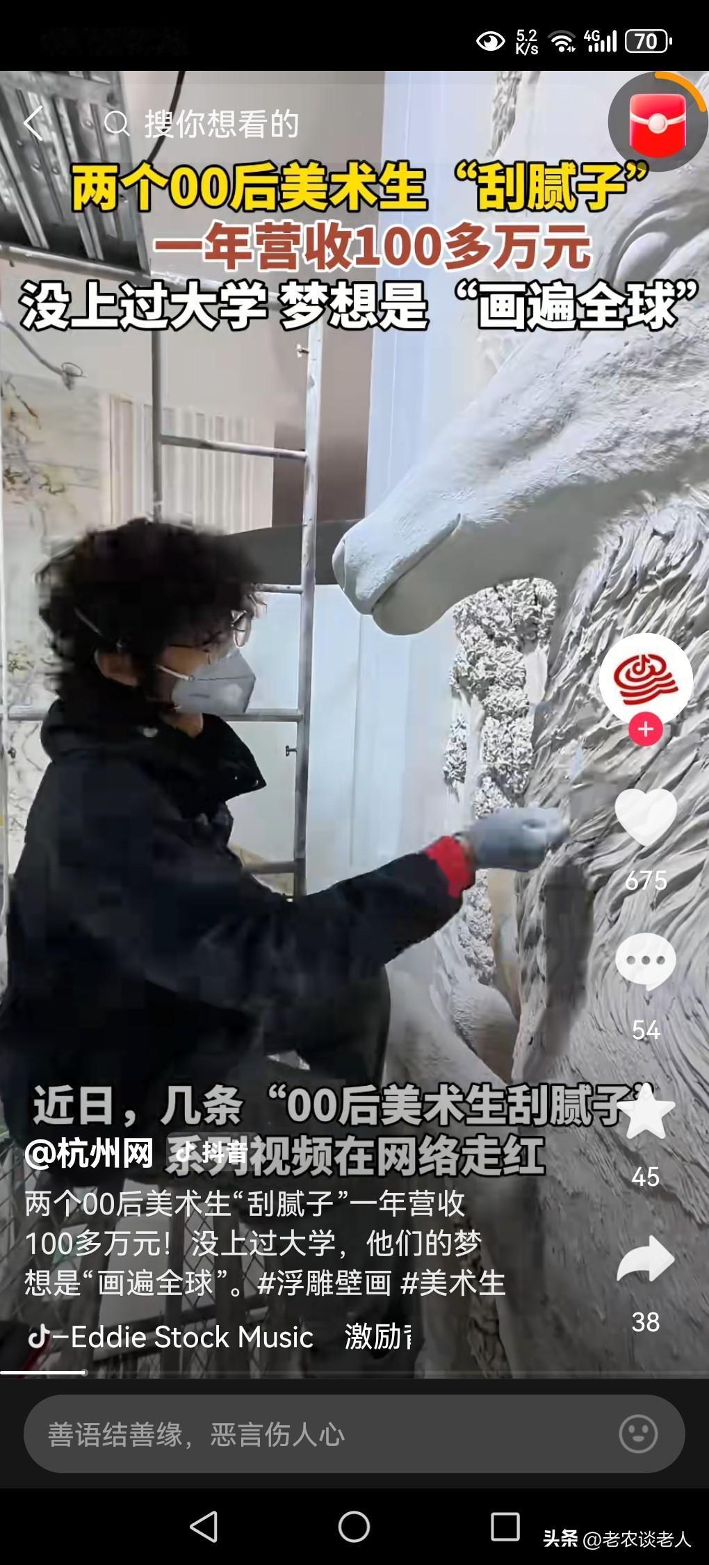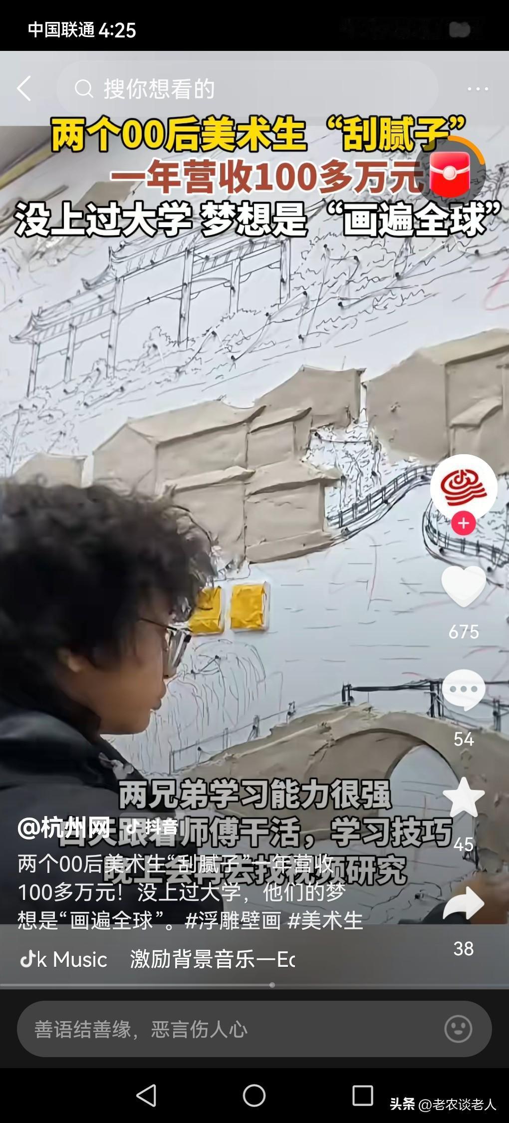 两个男孩“刮腻子”年入100多万元! 现在时代变了,社会也变了,科学技术也变了,经济发展了,人们的思想观念同样的发生了很大的改变。 过去每一个家庭养孩子,都是要把孩子多读书,多上学,争取高考考取一个好大学,就能改变孩子的前途和命运,就会改变孩子的人生。 这就是人们孜孜以求的,知识改变命运的现实。 而现在的孩子,不一定要多读书多上学,多学书本上的知识,考上一个好大学,就能改变自己的前途和命运,但是孩子有他的兴趣爱好,有他的追求,当孩子们的这些兴趣爱好和追求,达到了一定水平的时候,达到登峰造极的时候,同样会改变自己的命运和前途。 据媒体1月26日报道,在河北邯郸一户家里搞装修靠“刮腻子”谋生的一对00后兄弟俩,用装修腻子给人家装修墙面的时候,绘制雕塑,浮雕壁画,如山水图画,人物动物造形等艺术作品,形象逼真,栩栩如生,十分漂亮,比一般的大学美术生的作品还要美观,还要优质。 因此,这兄弟俩凭借自己对美术的爱好,走出了一条艺术之路,他俩的艺术作品深受用户的喜欢,得到了人们的高度评价,因此生意越来越多,越来越好,他的钱也越赚越多,一年下来能赚到100多万元。 他们兄弟俩,并不是大学美术专业的学生,他们在初中和高中的时候,学习成绩并不理想,但是,他们非常喜爱美术,喜欢画画,喜欢做手工艺品,动手能力非常强。因此,他俩高中毕业以后,就在外打工,给人家房屋装修批刮腻子粉谋生,后来人家发现他的画儿画的好,他的浮雕造型非常美观,所以有很多人找他们画画做浮雕。因此,他俩的艺术作品哄动当地的房屋装修行事。现在他们俩算是当地的名师巧匠,年收入达100多万元,真够了不起的!