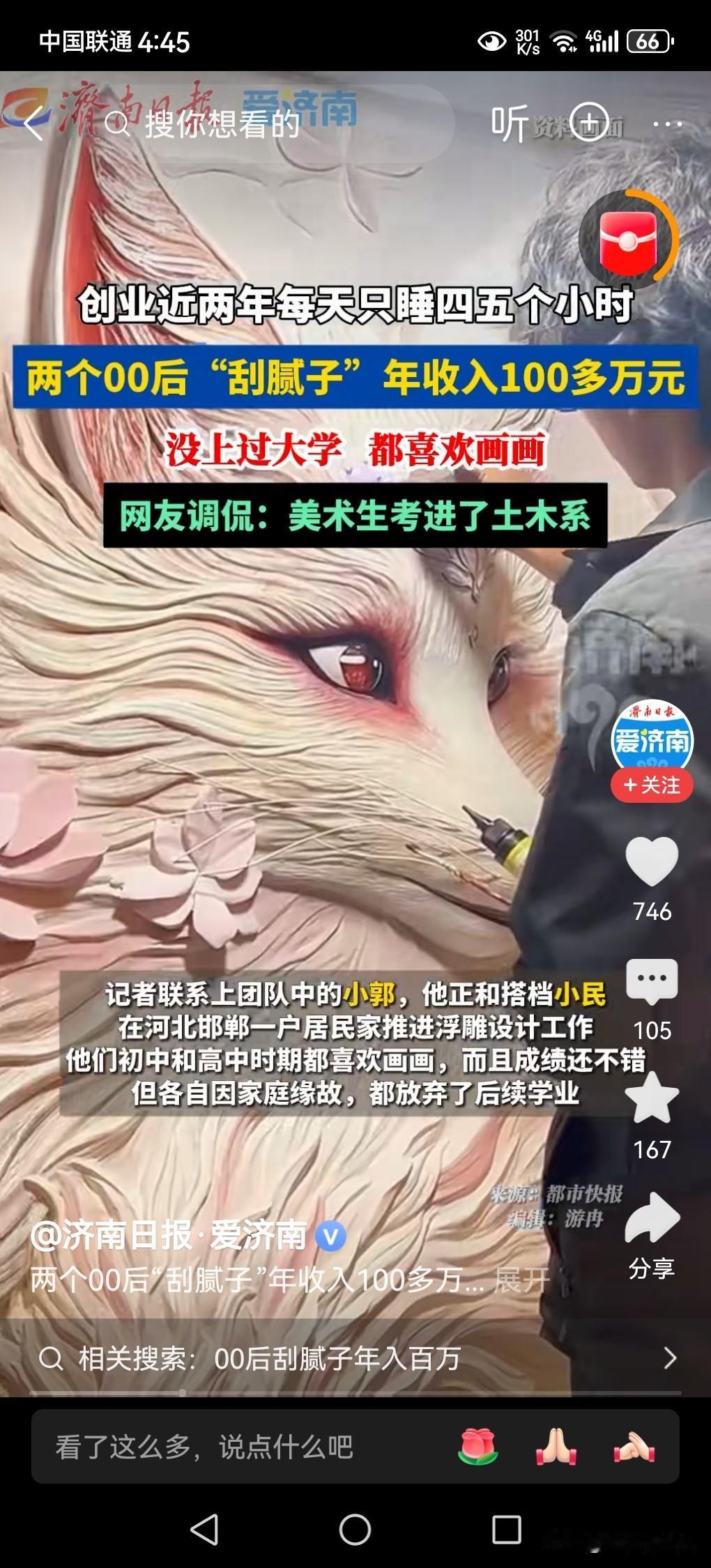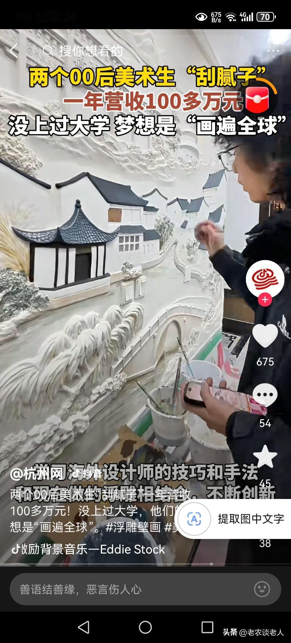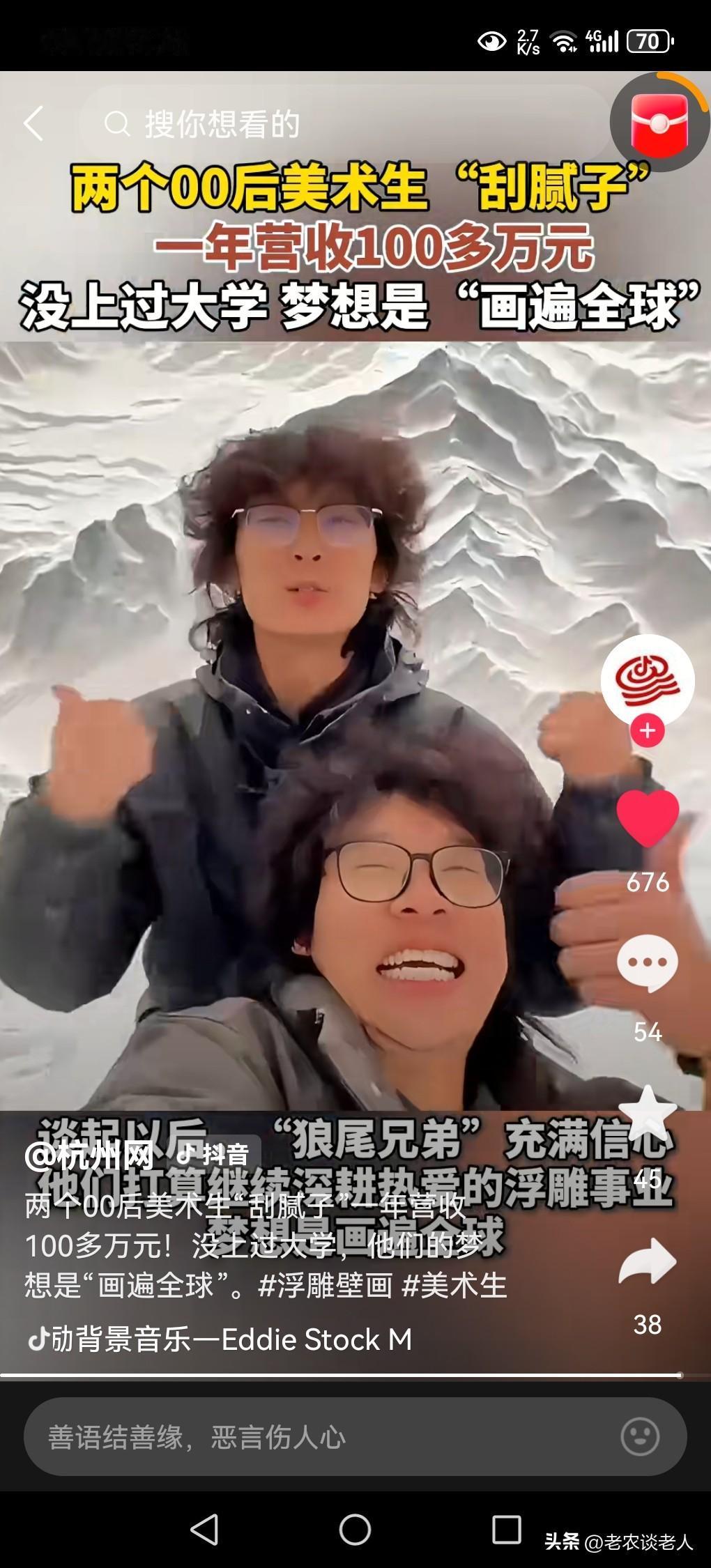 两个男孩“刮腻子”年入100多万元! 现在时代变了,社会也变了,科学技术也变了,经济发展了,人们的思想观念同样的发生了很大的改变。 过去每一个家庭养孩子,都是要把孩子多读书,多上学,争取高考考取一个好大学,就能改变孩子的前途和命运,就会改变孩子的人生。 这就是人们孜孜以求的,知识改变命运的现实。 而现在的孩子,不一定要多读书多上学,多学书本上的知识,考上一个好大学,就能改变自己的前途和命运,但是孩子有他的兴趣爱好,有他的追求,当孩子们的这些兴趣爱好和追求,达到了一定水平的时候,达到登峰造极的时候,同样会改变自己的命运和前途。 据媒体1月26日报道,在河北邯郸一户家里搞装修靠“刮腻子”谋生的一对00后兄弟俩,用装修腻子给人家装修墙面的时候,绘制雕塑,浮雕壁画,如山水图画,人物动物造形等艺术作品,形象逼真,栩栩如生,十分漂亮,比一般的大学美术生的作品还要美观,还要优质。 因此,这兄弟俩凭借自己对美术的爱好,走出了一条艺术之路,他俩的艺术作品深受用户的喜欢,得到了人们的高度评价,因此生意越来越多,越来越好,他的钱也越赚越多,一年下来能赚到100多万元。 他们兄弟俩,并不是大学美术专业的学生,他们在初中和高中的时候,学习成绩并不理想,但是,他们非常喜爱美术,喜欢画画,喜欢做手工艺品,动手能力非常强。因此,他俩高中毕业以后,就在外打工,给人家房屋装修批刮腻子粉谋生,后来人家发现他的画儿画的好,他的浮雕造型非常美观,所以有很多人找他们画画做浮雕。因此,他俩的艺术作品哄动当地的房屋装修行事。现在他们俩算是当地的名师巧匠,年收入达100多万元,真够了不起的!