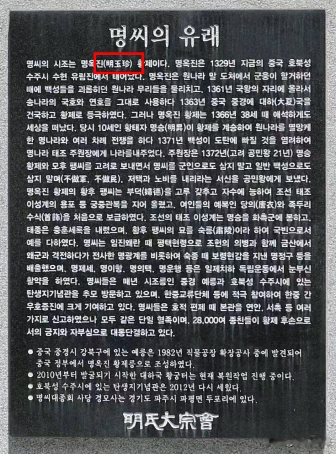 重庆睿陵与韩国明氏后裔的跨世纪寻根 1982年重庆江北施工时,意外发现元末大夏国皇帝明玉珍的“睿陵”,出土的赤黄缎绣衮龙袍等文物(后修复为16件国家一级文物),成为韩国约4万明氏后裔认祖的关键线索。 明玉珍是元末起义军领袖,1363年在重庆建立大夏国,1366年病逝后葬于睿陵。1371年其子明升降明,后被朱元璋迁往高丽(今朝鲜半岛),明氏血脉自此在当地扎根,逐渐成为涵盖法律、教育、军政领域的精英家族,被称为“法官家族”。 韩国明氏后裔的认祖之路有三大核心佐证: • 考古印证:睿陵出土的《玄宫之碑》记载的明玉珍生平、家族谱系,与韩国明氏族谱高度吻合。 • 科学确认:2003年中韩专家通过比对睿陵陪葬墓成员与韩国明氏后裔的Y染色体DNA,证实二者血缘一致。 • 制度化祭祖:自1995年韩国明氏大宗会组织首次正式祭祖后,每年清明前后,后裔都会组团赴重庆睿陵祭拜,至今已持续近30年,同时在韩国修建“大夏太祖明玉珍皇帝景慕祠”与望祭台,编纂《明氏大同谱》传承家族记忆。