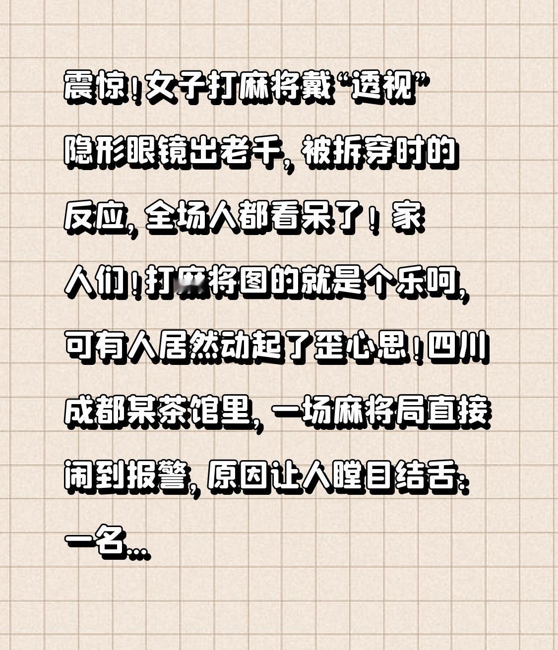 震惊!女子打麻将戴“透视”隐形眼镜出老千,被拆穿时的反应,全场人都看呆了! 家人们!打麻将图的就是个乐呵,可有人居然动起了歪心思!四川成都某茶馆里,一场麻将局直接闹到报警,原因让人瞠目结舌:一名女子戴着“特殊隐形眼镜”,能看穿麻将牌面,短短3小时赢了2万多,最后被同桌牌友当场拆穿,场面一度失控! 先给大家还原一下现场:当天4个人凑局打麻将,一开始大家没觉得不对劲,可越打越蹊跷——这名张姓女子运气好到离谱,不管是杠牌、胡牌还是自摸,几乎把把都能精准拿捏,而且每次摸牌前都会下意识眨眼睛,出牌时毫不犹豫,连最难胡的“九莲宝灯”都能轻松凑成。 同桌的李大姐越想越不对劲:“我跟她打了5年麻将,以前她技术平平,怎么突然像开了挂?而且她今天戴的隐形眼镜反光特别奇怪,每次看牌都要凑近了眯着眼。”打到下午3点,张女士又一把自摸大满贯,赢走8000多,李大姐终于忍不住了,趁着她揉眼睛的空隙,一把按住她的手:“你这眼镜不对劲,摘下来看看!” 这一按,直接引爆了转折点!张女士瞬间脸色煞白,拼命反抗不让摘眼镜,嘴里还喊着“你们无理取闹”。僵持之下,茶馆老板赶紧过来调解,没想到张女士慌乱中把眼镜掉在地上,镜片摔碎后,大家发现镜片上有一层特殊涂层,而且她随身携带的麻将牌背面,居然有肉眼难辨的荧光标记! 原来这是一套“高科技作弊套装”:特制荧光麻将牌+带滤光功能的隐形眼镜,牌背面的标记只有戴这种眼镜才能看清,相当于自带“透视”功能。张女士坦白,这套装备花3000多网购的,想着过年打麻将赚点零花钱,没想到第一次用就被识破。 最让人无语的是,被拆穿后张女士还狡辩:“打麻将本来就是输赢凭运气,我这只是‘辅助’一下。”这话直接激怒了大家,牌友当场报警,最终张女士不仅要退还赢的2万多,还因诈骗被处以行政拘留5天。 其实打麻将就是朋友邻里消遣娱乐的方式,图的是开心热闹,靠作弊赢钱不仅丢了人品,还可能触犯法律,真的得不偿失!现实中还有人用遥控骰子、记号麻将作弊,最后轻则闹掰翻脸,重则锒铛入狱,完全违背了娱乐的初衷。 不管是打麻将还是其他娱乐,诚信永远是底线。赢钱固然开心,但靠不正当手段得来的利益,迟早会付出代价。那些想着投机取巧的人,别忘了“聪明反被聪明误”,踏踏实实做人,规规矩矩娱乐,才能真正享受生活的乐趣。 你打麻将时遇到过出老千的情况吗?欢迎在评论区分享你的经历,提醒大家避坑!也别忘了转发给爱打麻将的朋友,让更多人知道,娱乐有底线,作弊不可取!