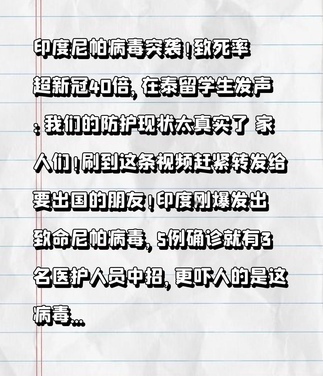 印度尼帕病毒突袭!致死率超新冠40倍,在泰留学生发声:我们的防护现状太真实了 家人们!刷到这条视频赶紧转发给要出国的朋友!印度刚爆发出致命尼帕病毒,5例确诊就有3名医护人员中招,更吓人的是这病毒致死率高达40%-75%,比新冠致命40倍还多,目前连疫苗和特效药都没有!而在泰国的中国留学生一段发声,戳中了无数人的心! 这名在曼谷留学的同学说,现在泰国街头已经开始紧张了,学校专门开了防疫班会,超市里口罩又被抢空,身边不少同学都在打听回国机票。“本来计划假期去印度旅行,现在直接取消,连泰国本地的夜市都不敢去了,就怕接触到跨境游客”,留学生的话道出了所有在外同胞的担忧。 很多人可能会说“离我们太远,不用慌”,但转折点来了:这病毒的隐蔽性远比我们想象中可怕!它的潜伏期最长能到45天,初期症状就是发烧、头痛,和普通感冒没区别,可24小时内就可能急转直下引发脑炎,20%的幸存者还会留下终身癫痫、认知障碍的后遗症。更关键的是,它能通过被果蝠污染的水果、水源传播,甚至出现了人传人案例,这次印度的医护人员就是在救治患者时被感染的。 但大家也别过度恐慌!尼帕病毒虽然致命,传播力却远不如新冠,不会通过普通飞沫扩散,只要做好防护就能有效规避风险。在泰留学生就分享了他们的防护心得:不买野外掉落的水果,饭前饭后彻底洗手,尽量不去人群密集的跨境口岸,还特意存了中国驻泰使馆的求助热线+66-2-245-7010。 其实不管是在海外的同胞,还是计划出国的朋友,面对疫情最该做的就是“科学防护不松懈”。非必要别去印度疫情区,赴泰旅游要准备72小时核酸证明,入境后多留意身体状况,出现不适及时就医。那些说“小题大做”的人可能忘了,新冠疫情教会我们的,就是对未知病毒保持敬畏。 看着在泰留学生小心翼翼防护的样子,真的让人揪心又感动。他们背井离乡求学,却要时刻应对疫情风险,背后是家人无尽的牵挂。希望所有在外的同胞都能平安健康,也希望这场疫情能早日得到控制。 你觉得面对尼帕病毒该如何做好防护?欢迎在评论区分享你的建议,让更多人看到!也别忘了转发给身边的朋友,多一份提醒就多一份安全!