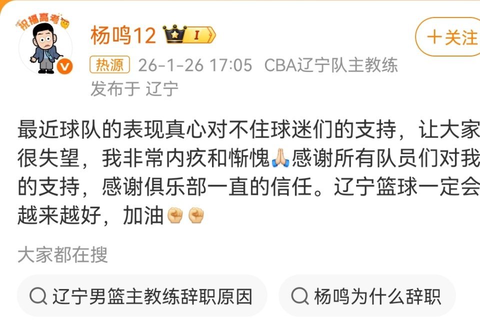 杨鸣发博回应杨鸣辞职回应满是愧疚与担当!率辽篮拿过三连冠的功勋主帅,扛着阵容变动与身体压力,一句对不住球迷,让人感觉很心酸。