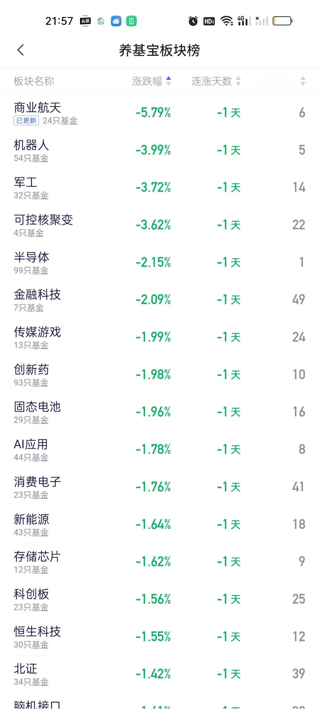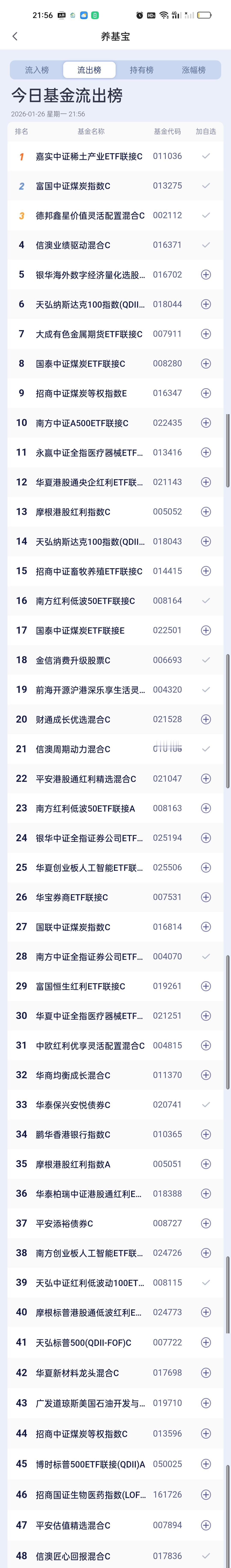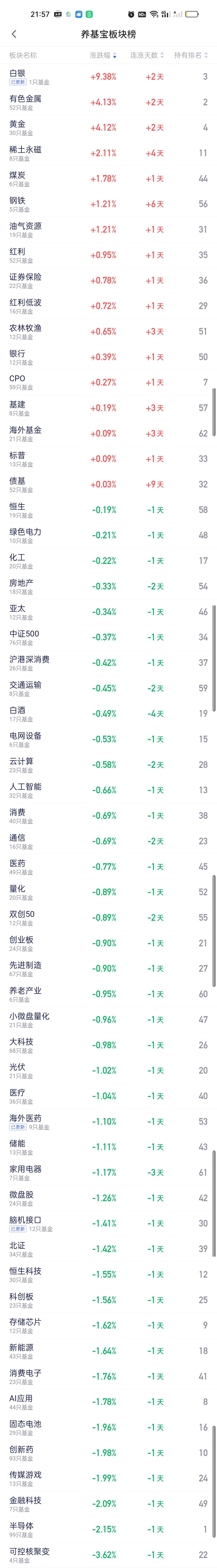 今日基金加仓榜,减仓榜以及板块榜已全部更新完毕。加仓榜前三名是南方有色金属ETF联接,国泰有色矿业ETF联接,华夏黄金ETF联接。减仓榜前三名是嘉实中证稀土产业ETF联接,富国中证煤炭指数,德邦鑫星价值。 板块方面,涨幅居前的是白银,有色金属,黄金,稀土永磁,煤炭,钢铁,油气资源,跌幅靠前的是商业航天,军工,机器人,可控核聚变,半导体,金融科技,传媒游戏,创新药,固态电池,AI应用,消费电子,新能源,存储芯片,科创板,恒科。