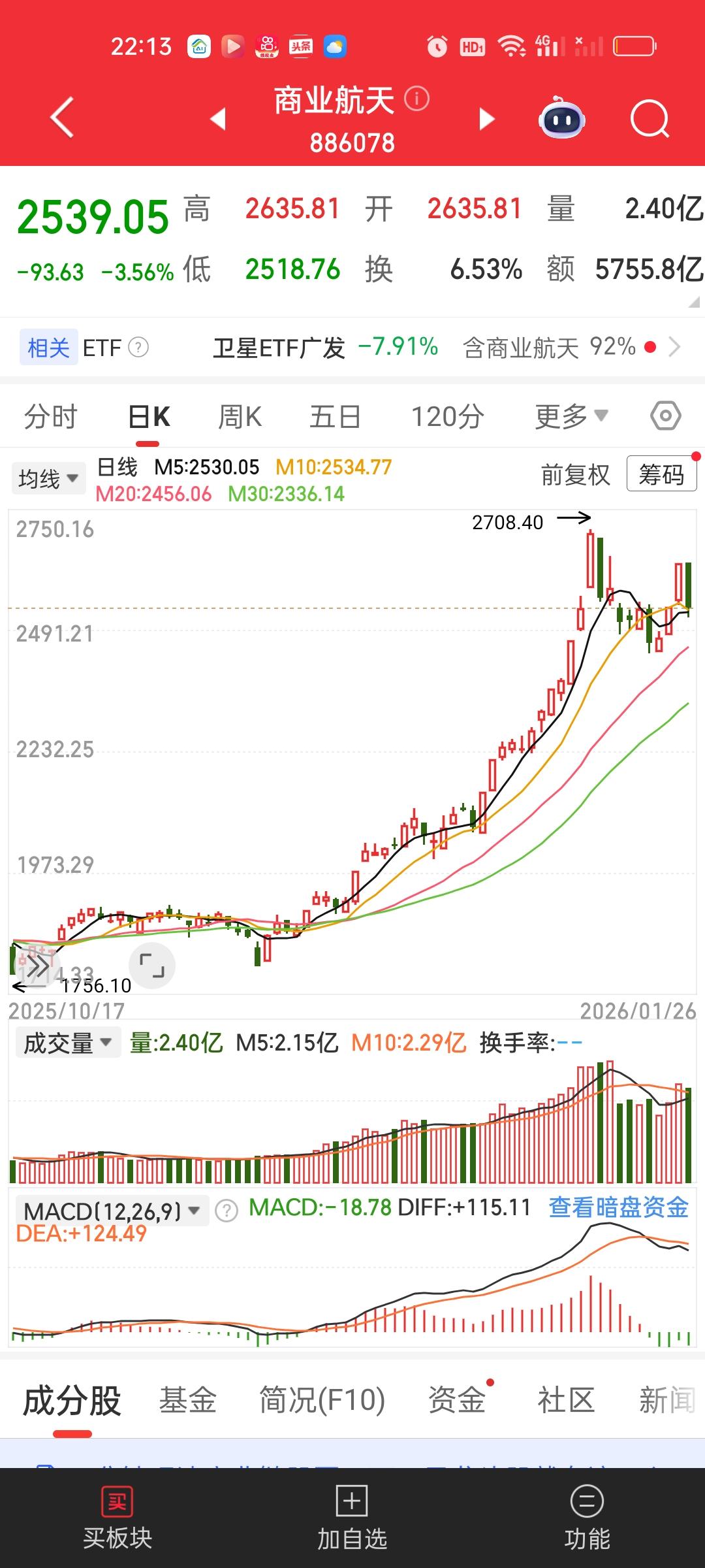 商业航天明天还会考验一下20日线,盘中破一下不要紧,但收盘一定要收在20日线上。今天20日线2456.06,今天收盘价2539.05,明天20日线大概率会再抬升20个点到2476,2476/2539.08=0.9751,只有2.49%的空间,2456.06/2539.05=0.9673,今日20日线距离今天收盘价也只有3.27%。所以明天看见下杀一定不能慌。先观察走势,再做决定!