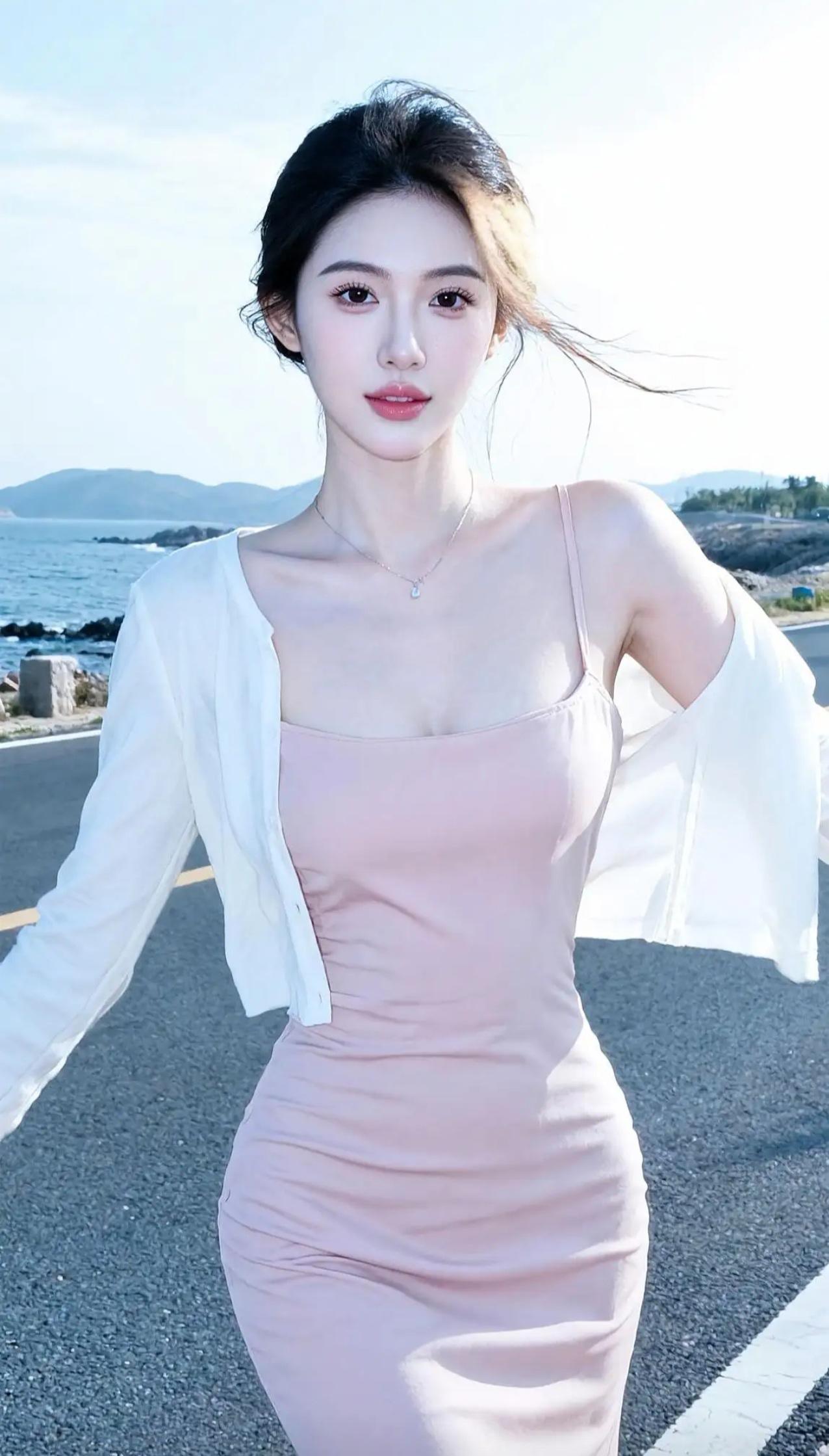 这身粉色挂脖长裙,简直是为她量身定做的天工造物!那柔滑的布料如春日初融的溪水,轻