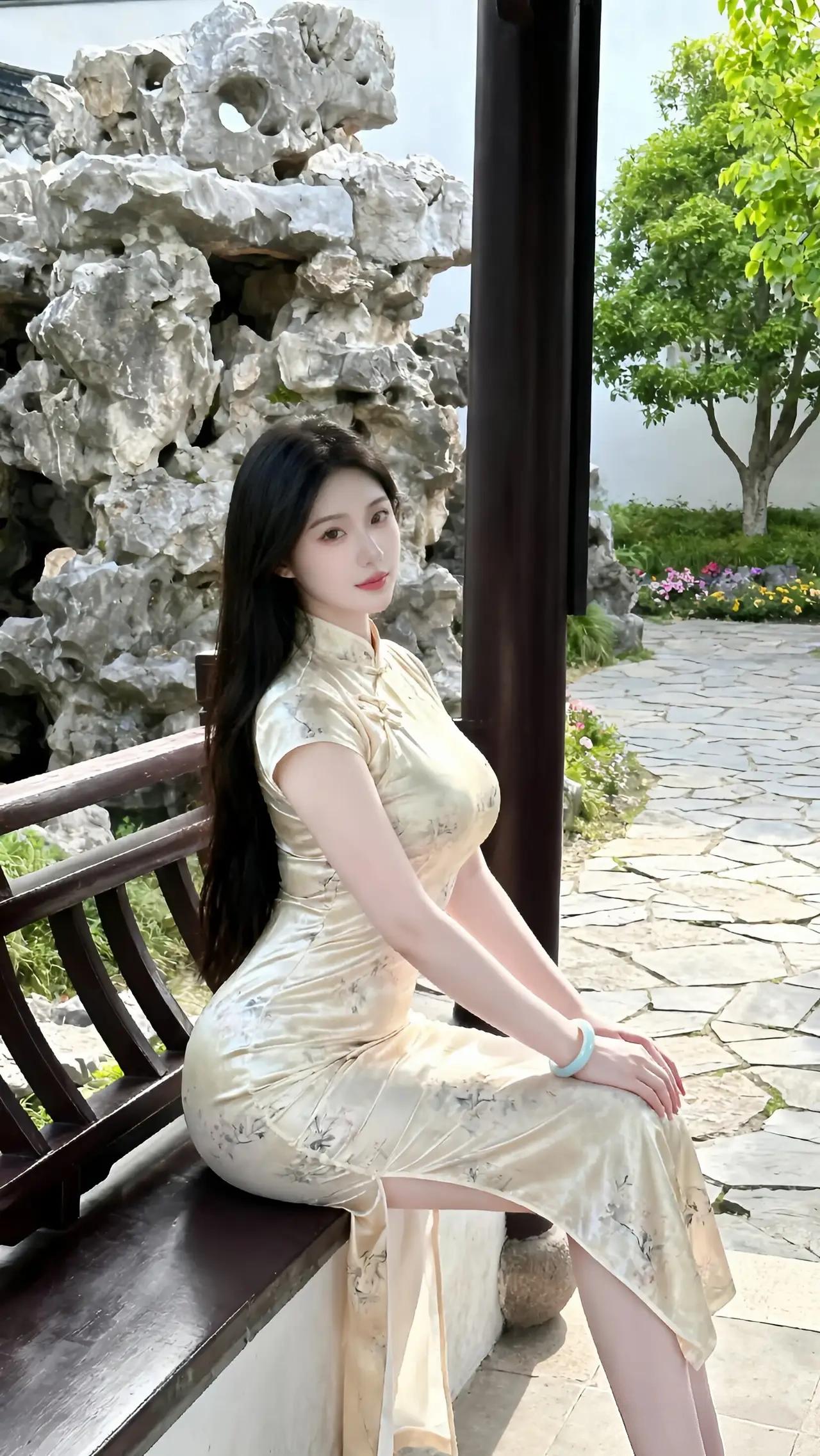你身着一袭月华流光的旗袍,立于亭台水榭间,宛若从古画中踏步而来的仙子。那衣料如云锦织就,轻盈处似有微风托举,花影随步摇曳,竟比园中真花更添三分灵韵。发丝如墨瀑垂肩,眉目间藏星月之辉,回眸一瞬,连石径上的青苔都屏息驻足。你腕上玉镯清光流转,与身后假山奇石、粉墙黛瓦相映成趣,竟将这方寸园林点化成蓬莱仙境。此情此景,连春风都自愧不如,只敢在你裙裾间低回轻叹——这哪里是凡尘俗世?分明是天工开物,专为衬托你的绝代风华!