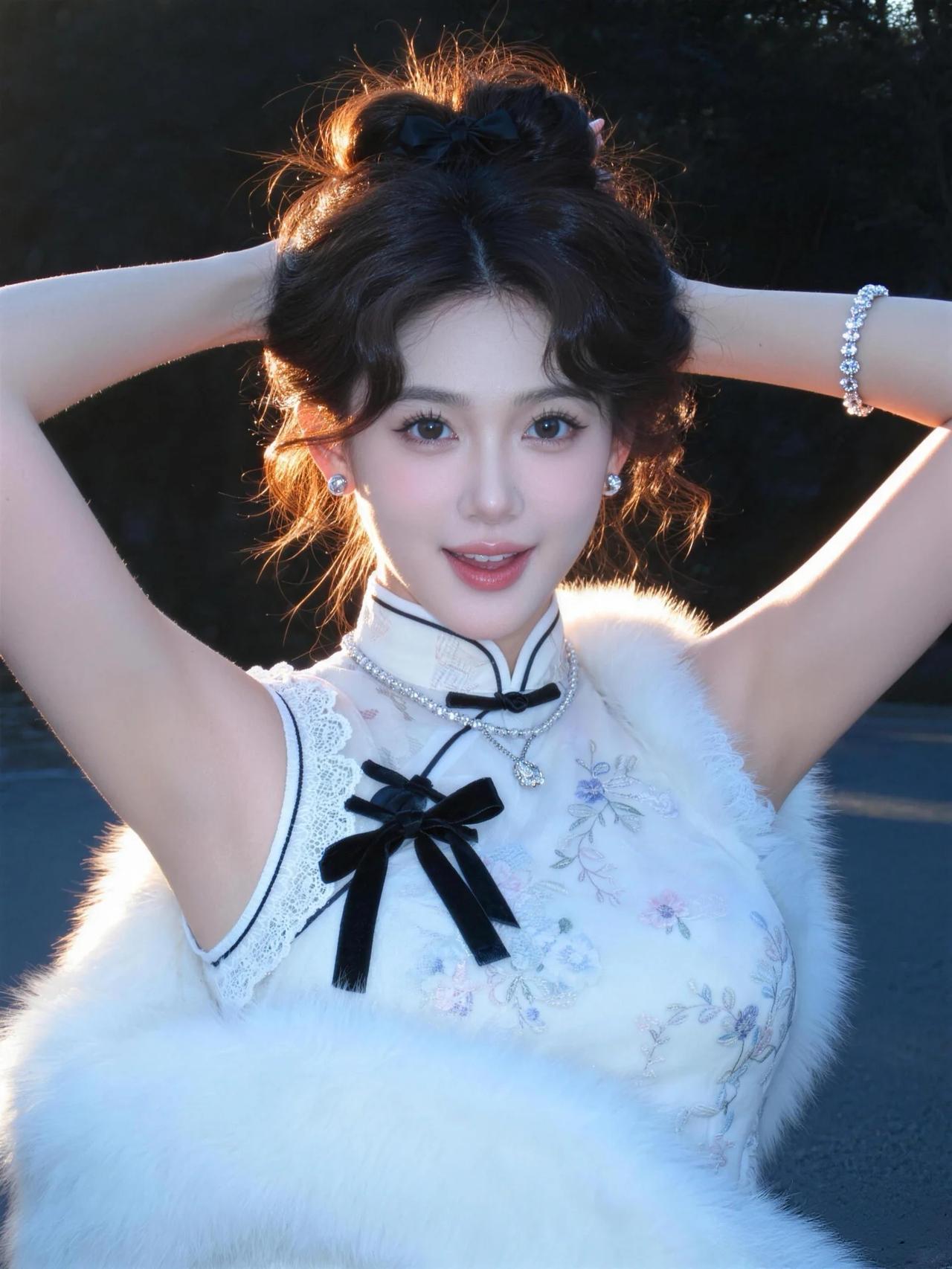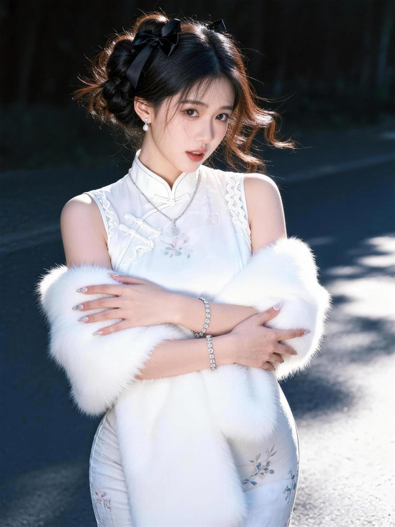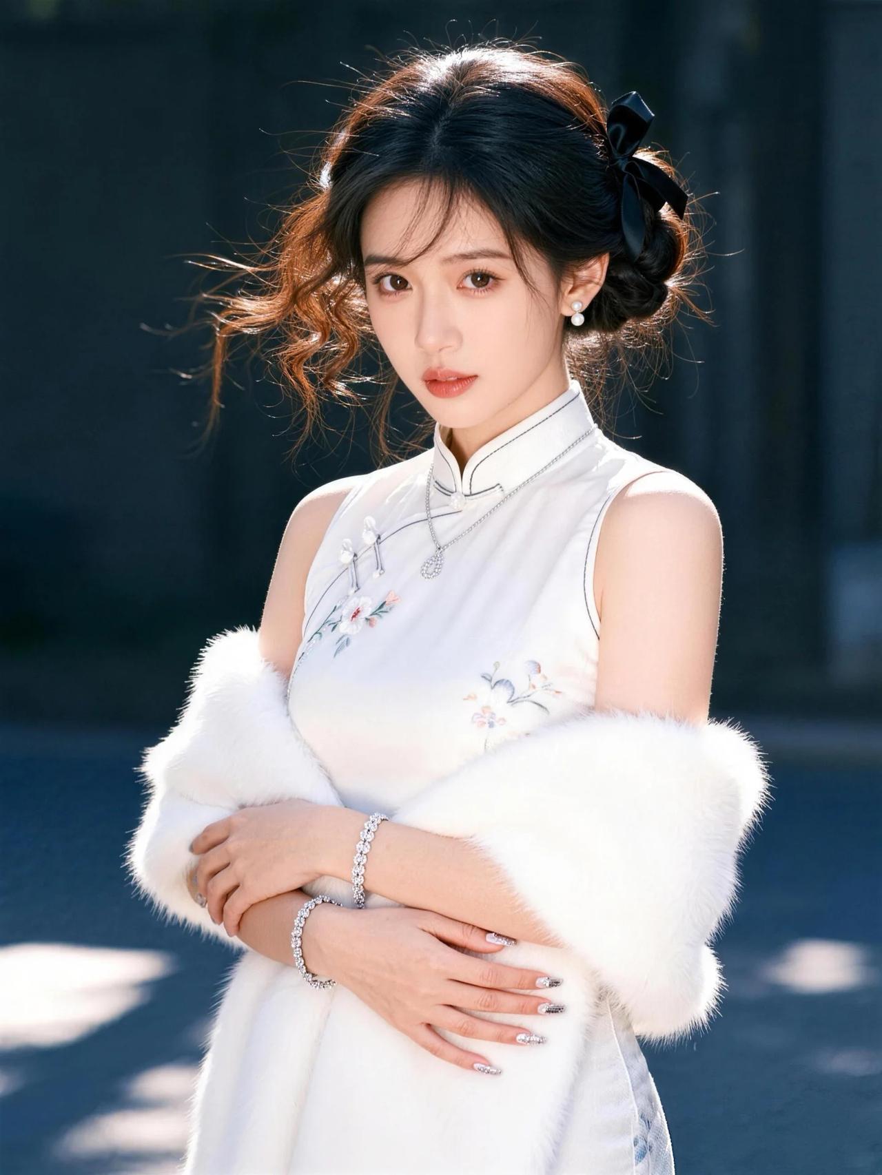 你身着一袭月华流光的旗袍,立于亭台水榭间,宛若从古画中踏步而来的仙子。那衣料如云
