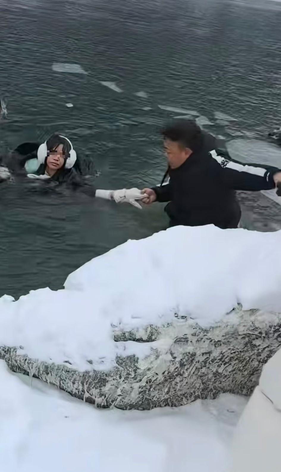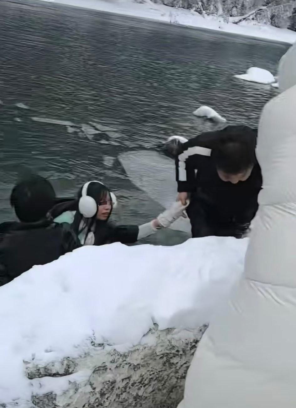喀纳斯美是美,但再美也没生命美。 一年轻女子在美景里落入冰水,幸亏得几位男士舍身相救。 据称是为了出片儿,到河边拍照,不慎掉下去的。 光看镜头不注意脚下很危险,冰面很滑,零下十几度,落水里没多久就会失温。 而且这里是活水,分分钟能被冲走。 只能说她足够幸运,有人跳进水里去救,其他人手拉手拉出一条生命通道。