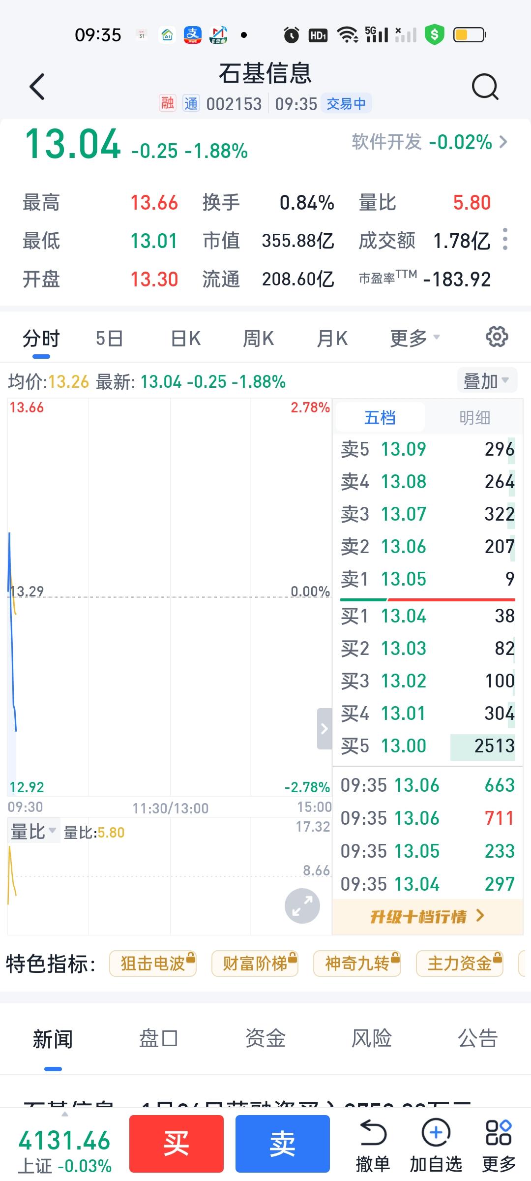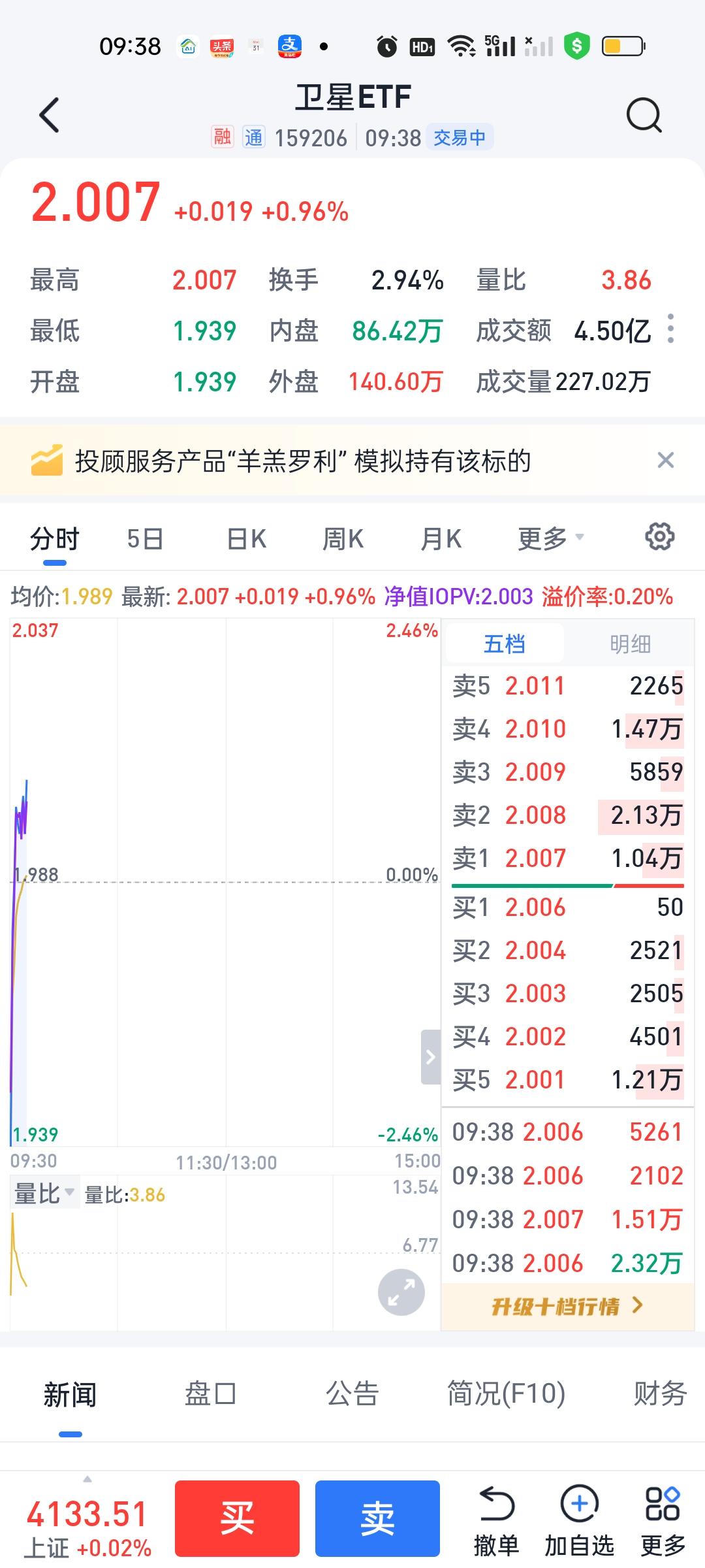 石基集合竞价阶段是涨停的,我还高兴了一下,以为今天可以吃点小ROU,因为300股有400元收益。结果开盘就跳水,我也把昨天买进的300股全部清空了,卫星ETF严格按照昨天的操作策略。 缺口处1.947为第一买点,20日线的位置为第二买点。 今天集合竞价阶段直接到了第一买点,我也是毫不犹豫的挂单顺利买进,然后挣了50个基点直接卖出。2分钟时间1200股挣了60元。我已经很满足。下一步还是在20日线这里埋伏2000股先。且战且退!这个位置还是太高,只能边打边撤,不能恋战!