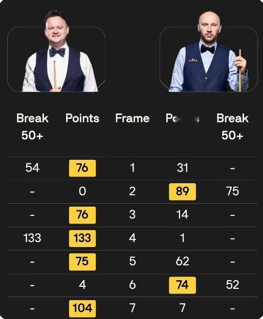 大嘴墨菲5-2完胜舒尔第!强势晋级德国大师赛的32强 在刚刚结束的斯诺克德国大师赛的延期资格赛比赛中,大嘴墨菲迎战扎克舒尔第。墨菲轰出一杆破百,打出一杆50+,5-2战胜扎克舒尔第,晋级德国大师赛的32强,下一轮迎战勒克莱克。比赛过程如下: 第一局,墨菲凭借单杆54分,76:31先拔头筹,取得开门红。 第二局,舒尔第立即还以颜色,凭借单杆75分,89:0扳平局分。 第三局,墨菲凭借成功的防守,多次上手零碎得分,76:14获胜,局分2-1领先。 第四局,墨菲轰出单杆133分破百再下一局,局分3-1领先进入局间休息。 第五局,墨菲延续良好的状态,凭借零敲碎打得分,75:62单局逆转获胜。局分4-1领先,率先拿到赛点。 第六局,舒尔第凭借单杆52分,74:4扳回一局,挽救一个赛点,把局分追到2-4。 第七局,墨菲凭借成功的防守,多次上手零碎得分,104:7收割比赛。最终大嘴墨菲5-2战胜扎克舒尔第,晋级德国大师赛的32强,下一轮迎战勒克莱克。墨菲评论 墨菲争议