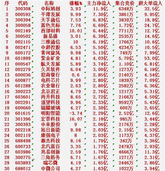 1月27日开盘45分钟,主力资金“买入的 ”的30名单一览! 中际旭创:净流入 11.9亿元 平潭发展:净流入 7.30亿元 天孚通信:净流入 6.83亿元 蓝色光标:净流入 6.69亿元 西部材料:净流入 6.44亿元
