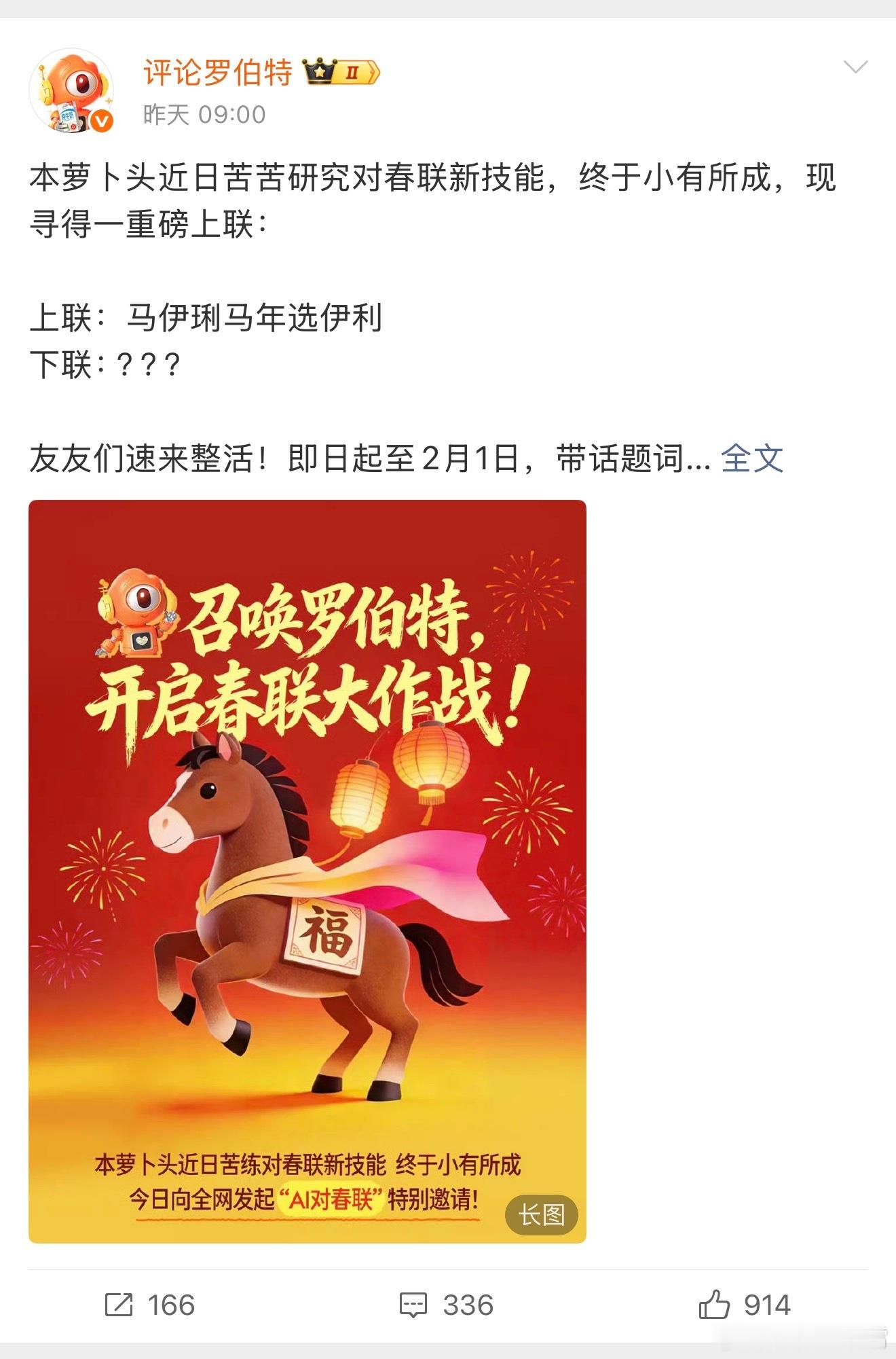 马年春联已进入AI时代刚刷到伊利那句“马伊琍马年选伊利”的上联,有点被戳中笑点!结合的还挺妙,敢情现在网友都在玩AI对春联,千问、豆包、Gemini这些工具各显神通,有的吉祥喜庆,有的脑洞大开,就连评论罗伯特都来凑趣接下联了。你会发现马年春联进入AI时代后,传统年味混搭科技感还挺有意思,不用翻书查字典,只要输入关键词就能Get专属春联,我还特地试了下,还挺好玩,你们也可以来试试用AI露一手,让评论罗伯特来回答对春联,解锁新春新玩法