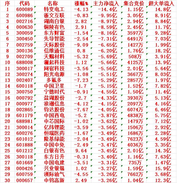 1月27日上午盘,主力趁低位,大幅买入的30名单: 中际旭创:涨幅 +5.67%,净流入 21.9亿元 新易盛:涨幅 +4.58%,净流入 14.0亿元 工业富联:涨幅 +3.26%,净流入 13.2亿元 天孚通信:涨幅 +8.93%,净流入 10.6亿元 平潭发展:涨幅 +9.99%(涨停),净流入 9.32亿元 1月27日中午收盘,主力资金“大幅卖出”的30名单: 特变电工:跌幅 -4.13%,净流入 -14.4亿元 浙文互联:跌幅 -0.83%,净流入 -9.95亿元 湖南白银:涨幅 +2.82%,净流入 -8.97亿元 铜陵有色:涨幅 +2.91%,净流入 -8.59亿元 东方财富:跌幅 -1.54%,净流入 -8.16亿元