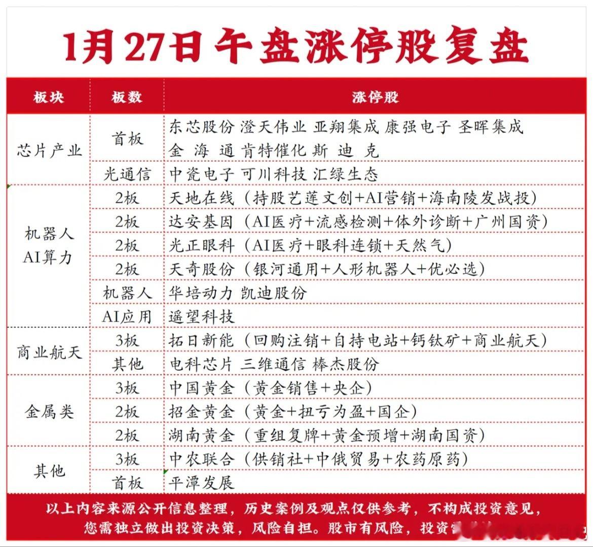 1月27日涨停强势板块复盘今日市场结构性行情凸显,贵金属与有色金属板块、商业航天