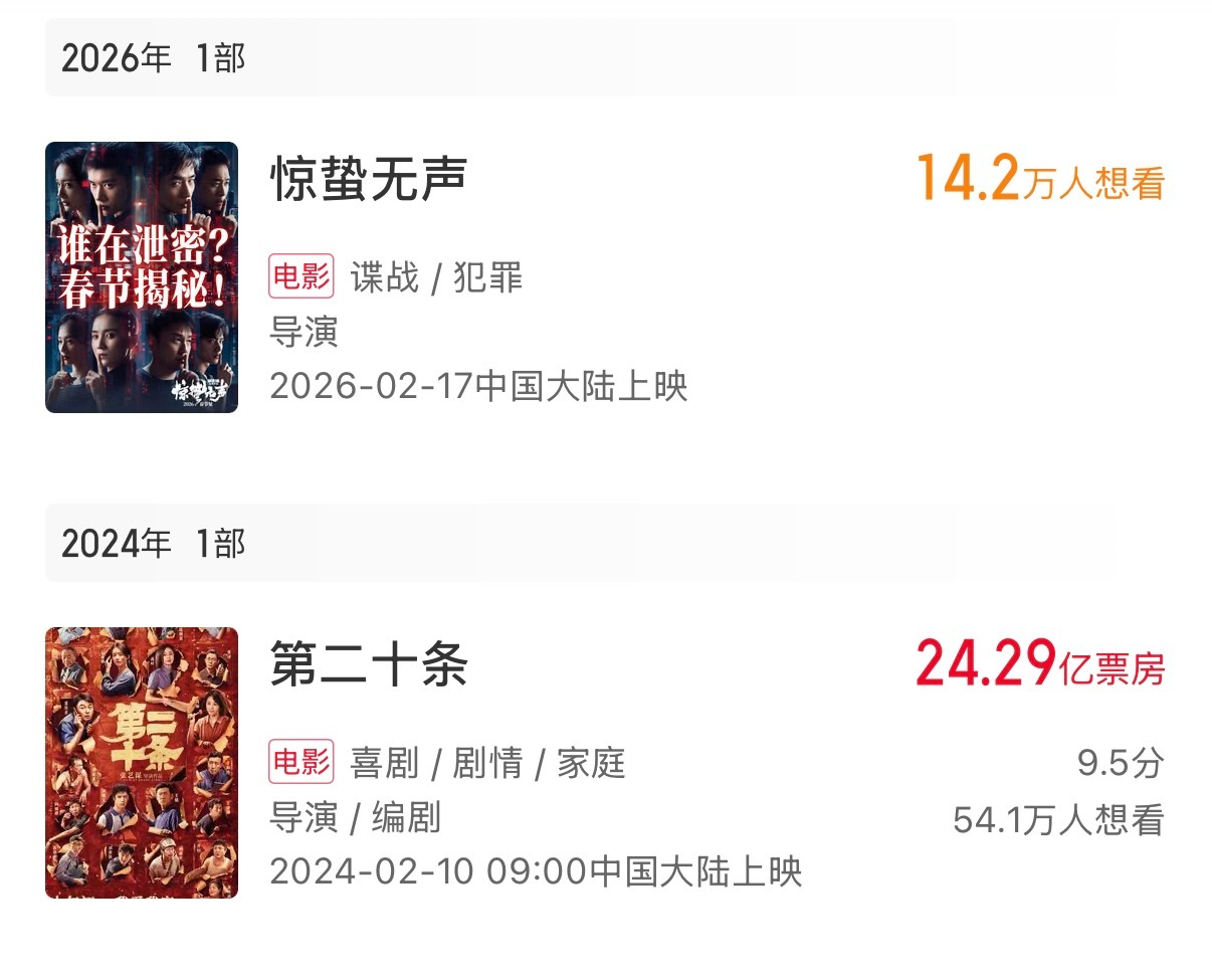张艺谋导演的票房是从2021年的电影《悬崖之上》12亿开始的,2022年《狙击手》6亿,2023年《满江红》45.5亿,《坚如磐石》13.5亿,2024年《第二十条》24亿,我预测2026年《惊蛰无声》20亿票房左右吧。
