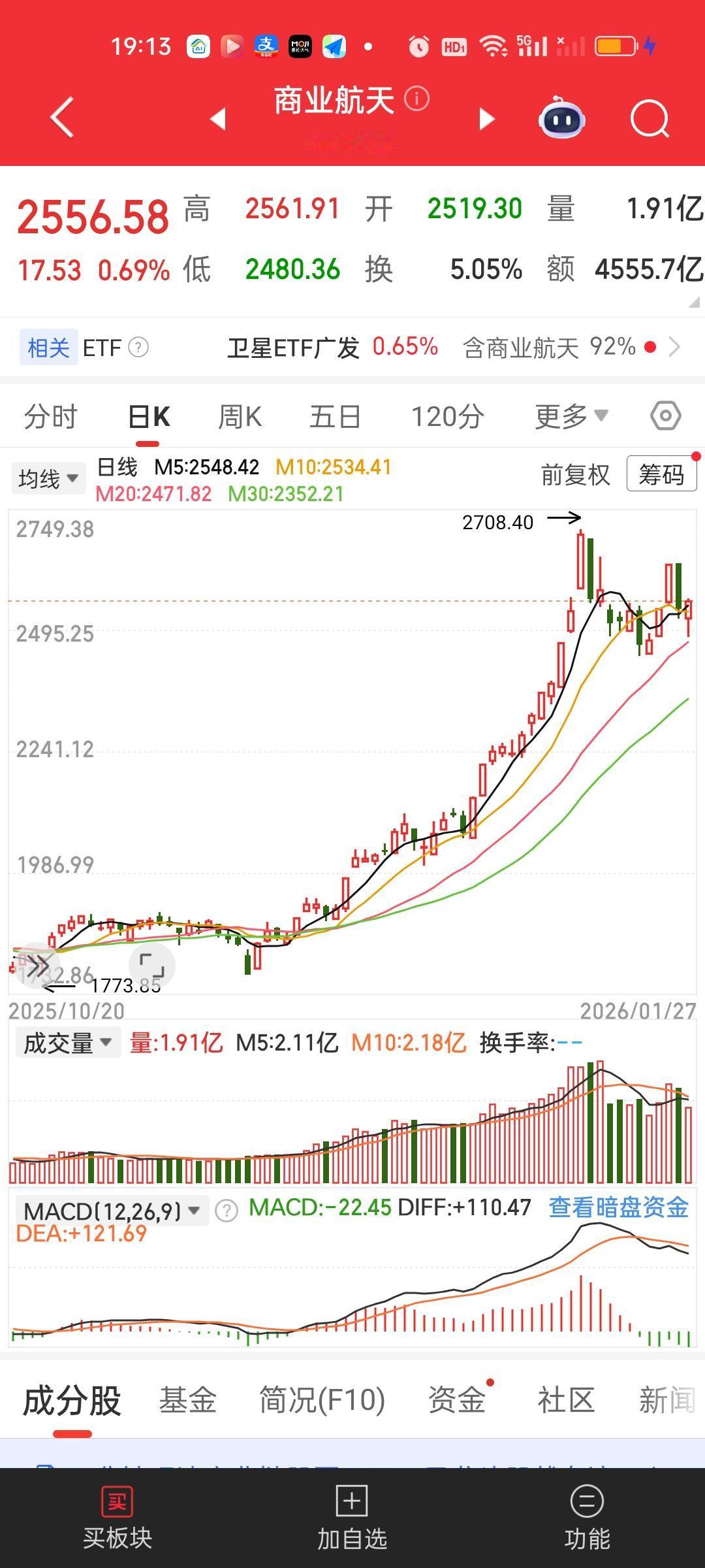商业航天的走势和昨天预测的走势是完全一致的,就是考验一下20日线然后再拉升,所以昨天晚上明确表明观点开盘看见下杀一定不能慌,要先观察走势然后再做决定。 昨天预测今天的20日线是2476点,今天最多下杀了2.31%到了2480点,刚好在20日线的位置撑住了。今天收盘收在了2556.58点,明天大概率还要考验一下20日线。 今天20日线是2471.82,那明天20日线大概率会抬升到2493左右。2493/2556=0.9753,依旧有2.47%的下杀空间。所以明天看到直接低开依旧不用恐慌。只要收盘收在20日线上方就不需要恐慌,盘中破一下是正常现象!