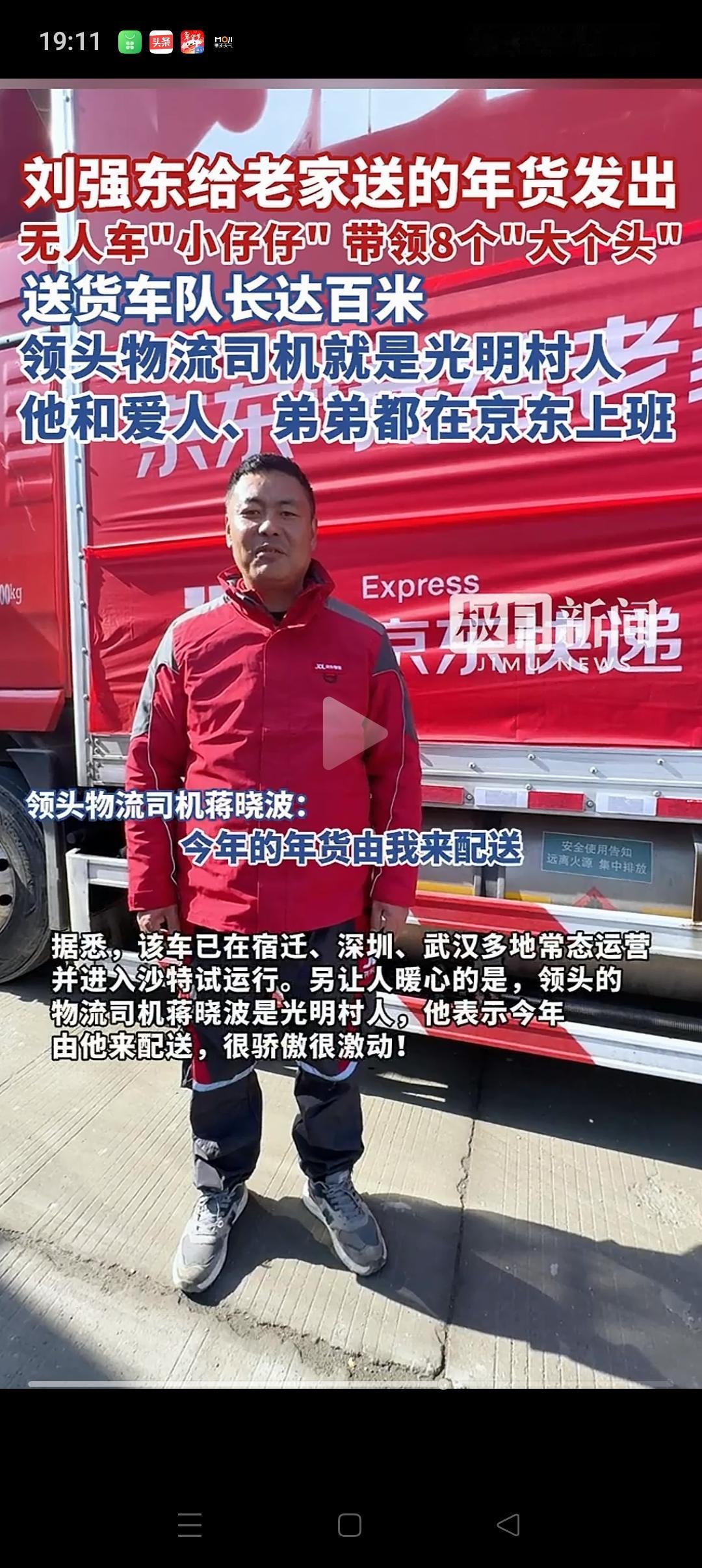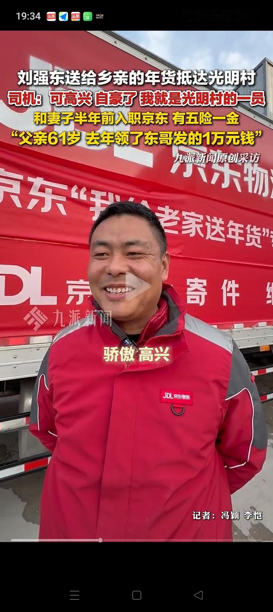 这位叫蒋晓波,是京东的物流司机,也是光明村人。这一次负责给光明村送年货,同时他的老婆,弟弟都在京东上班。 看到这里,你就知道东哥为什么会得到这么人的赞美了! 老家的人没工作?只要你愿意,随时随地可以来京东,一大家子照样安排。 老朋友的儿子没工作?只要你开口,马上给你安排。 可以说,刘强东符合任何一个中国人心目中对理想型的定义。 人到中年,还能一家人到京东上班,这是多幸福的一件事啊。也难怪蒋先生笑的这么开心[大笑][大笑]