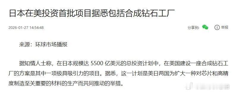 网传日本敲定对美5500亿美元(约4万亿人民币)投资计划的相关布局,这一动作被认为是其彻底倒向特朗普的明确表态。据悉日美正商议合建合成钻石生产工厂,试图实现该品类的自主供应。要知道工业钻石领域,国内占全球95%的市场份额,主产区就在河南。日本此番急于在关键供应链刷存在感的表忠心之举,只会让我们对其进一步收紧管控,相关关键领域的资源价格,后续也将持续走高。