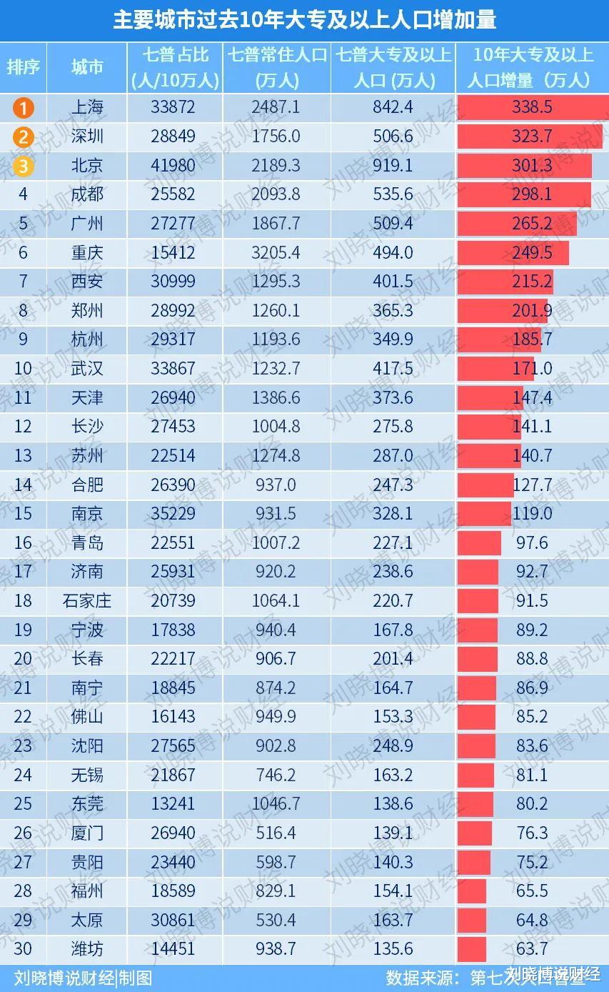 但2010年以后,情况发生了显著变化。从第六次人口普查到第七次人口普查,深圳大专及以上人口增长了323.7万人,仅次于上海位居全国第二。