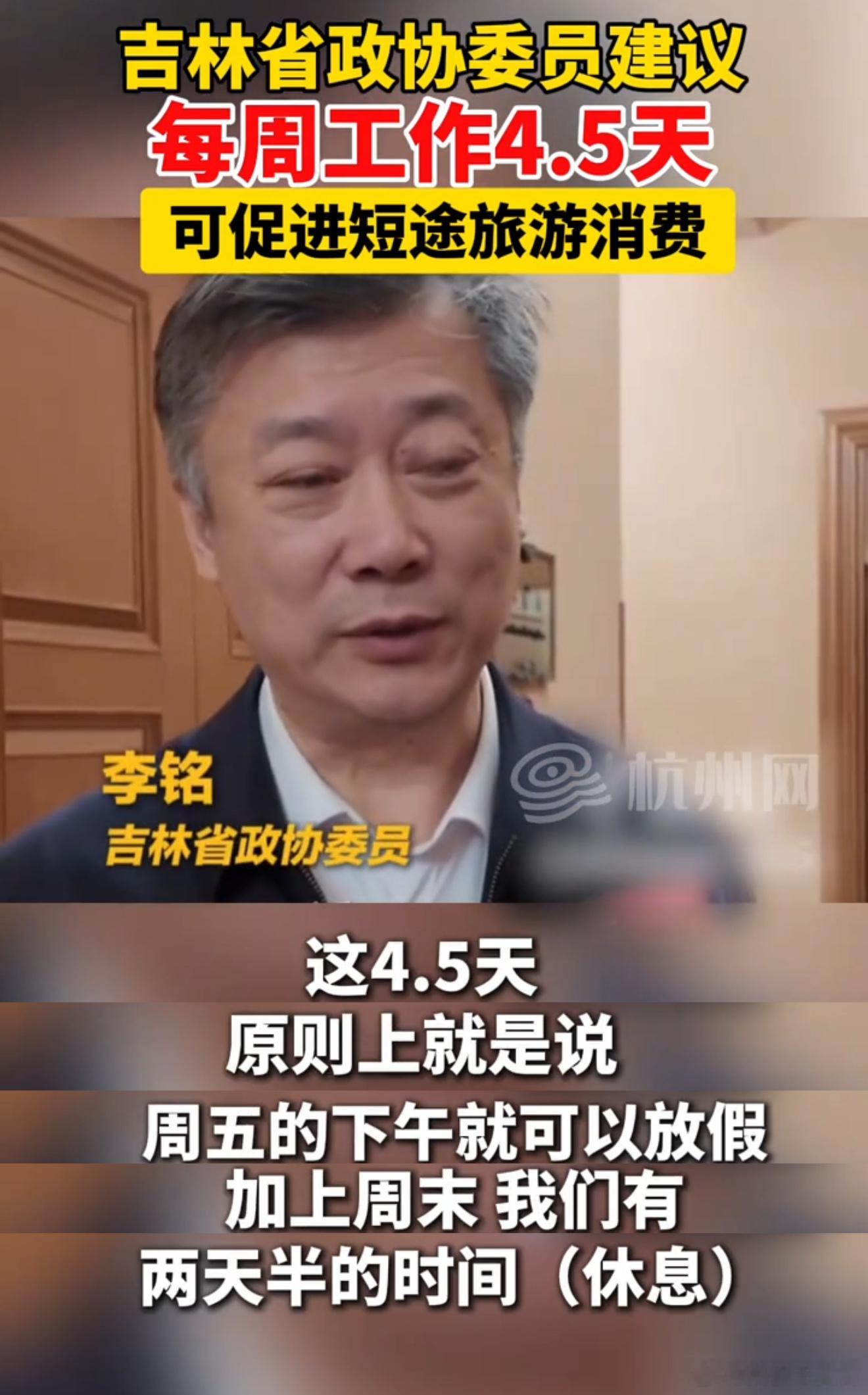 该说不说,这是真专家,吉林省政协委员建议试行4.5天工作制,周五下午 + 周末两天休息,一周上4.5天班,休2.5天,这样的确能促进消费拉动内需,不过现阶段的重点可能还是得先把上五休二落实好,据我所知很多行业都还没普及双休,话说你们有双休吗?