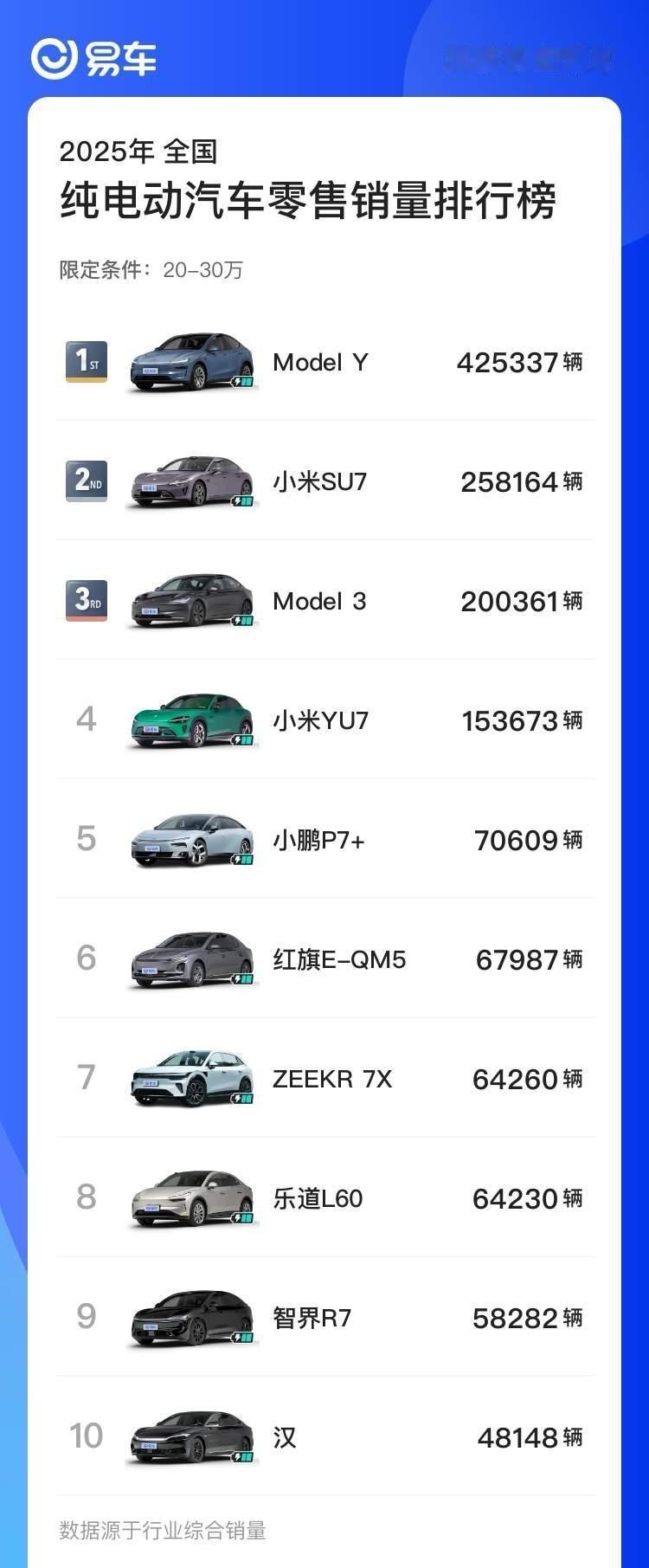 看了一眼易车榜的数据,2025年20-30万纯电车销量榜,前四被特斯拉和小米瓜分,小米确实很强。口碑看起来很差,销量却很强,其他汽车品牌怎么看?从数据看,排第5的小鹏P7,销量还没到第4小米YU7的一半。怎么看 从几个角度看,1、小米的用户群体,很强大,这批人代表了一个时代,年轻人以用小米为荣;2、小米的车断代级领先,这一点不太可能;特斯拉领先的年代,主要是三电、辅助驾驶;截至目前,特斯拉还有这个特征,但已经没早期那种遥遥领先的状态了;小米的产品力,用料之类,中等水平的可能性大,外观很受年轻人喜欢,方案存在很多不成熟的地方,但正在迅速迭代,比如门把手之类等等;3、其他品牌做的太差了。这没道理,产品力来说,其他品牌很多车问题不大,但外观肯定没有小米惊艳;方案,无论是底盘调教、智驾这些,领先小米的品牌很多,4、最核心原因,时代的问题,以及小米本省的品牌影响力确实很大