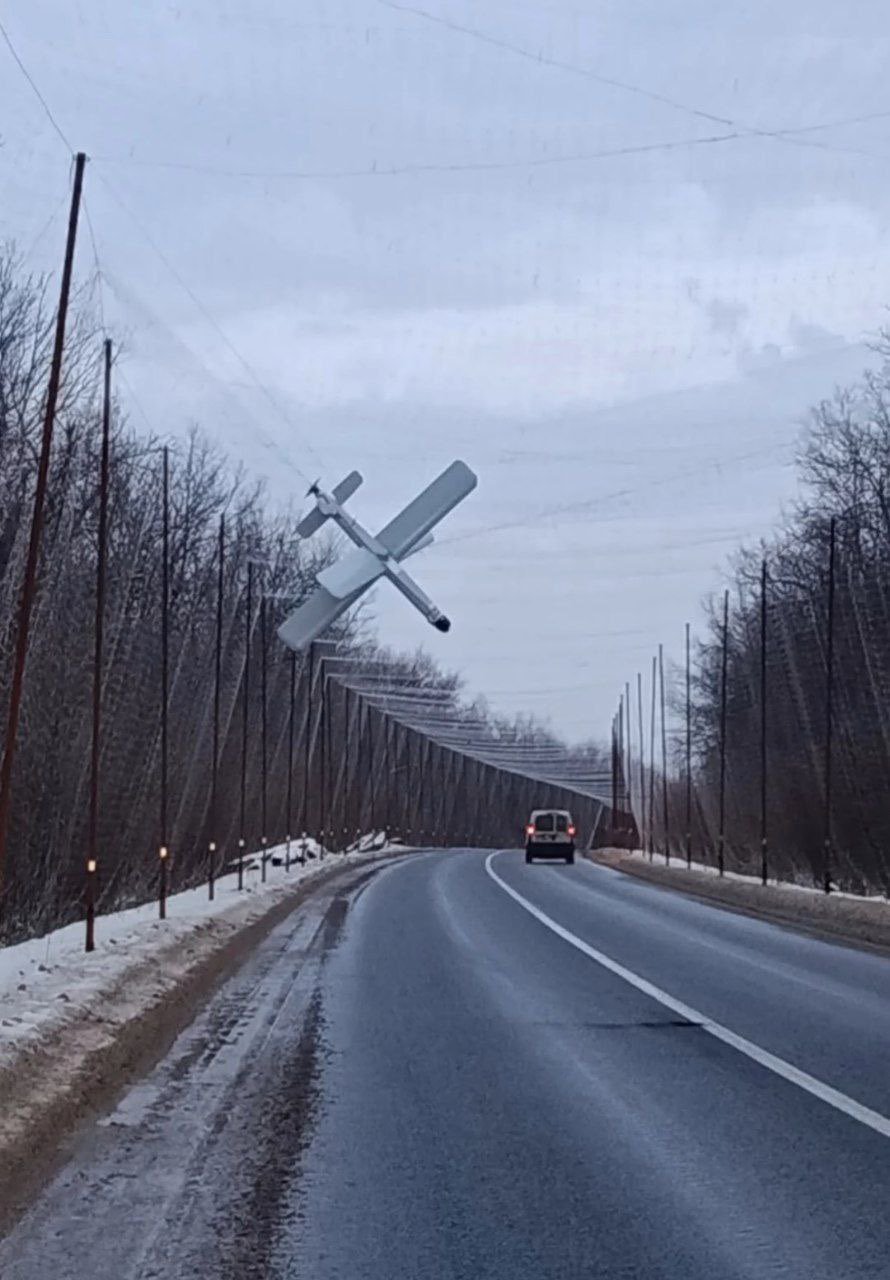 反无人机网确实有效!一架俄罗斯Zala攻击无人机被困在乌克兰前线附近的补给路线网上。