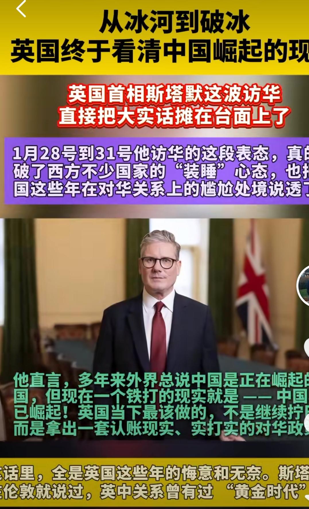 日不落终低头!斯塔默率50家英企访华,务实写满脸 这次英国首相斯塔默的表态,真是让人有点没想到,那叫一个通透。 以前西方媒体总说咱们“正在崛起”,人家这次直接改口:不是正在,是“已经崛起”。 这话听着确实顺耳,但这还不是最关键的。 关键是他那句关于“把头埋沙子里”的论调,承认无视咱们是不明智的。这不就是变相承认以前那种死要面子活受罪的策略行不通了吗? 嘴上说着好听,身体最诚实。 这回斯塔默也不是空手来的,身后跟着50多家企业的负责人,落地就直说为了给英国人民“谋福利”。 其实说白了,家里日子不好过,得出来找机会了。 想想以前那个不可一世的“日不落”,再看看现在这就差把“务实”写在脸上的斯塔默。 咱们也别太激动,这就是现实。 你有实力,连曾经的对手都得主动上门求合作,还得夸你两句。 这就叫形势比人强。 斯塔默这表态是真通透!不再嘴硬说中国正在崛起,直接承认已经崛起,还坦言无视中国不明智,总算放下了西方的傲慢。带着50多家英企来华谋合作,说到底还是英国国内日子不好过,想找机会谋福利。实力面前,再傲娇的对手也得低头,这难道不就是最真实的国际形势吗? 英国强硬表态