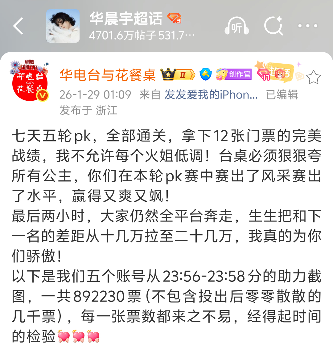 华晨宇粉丝真纯手搓,抢座赛敢放最后助力数这次微博之夜pk双开两个号全赢,加上其它的活动总共拿票29张,全明星排第五,排位歌手断层第一,老牌顶流真的依旧很能打!