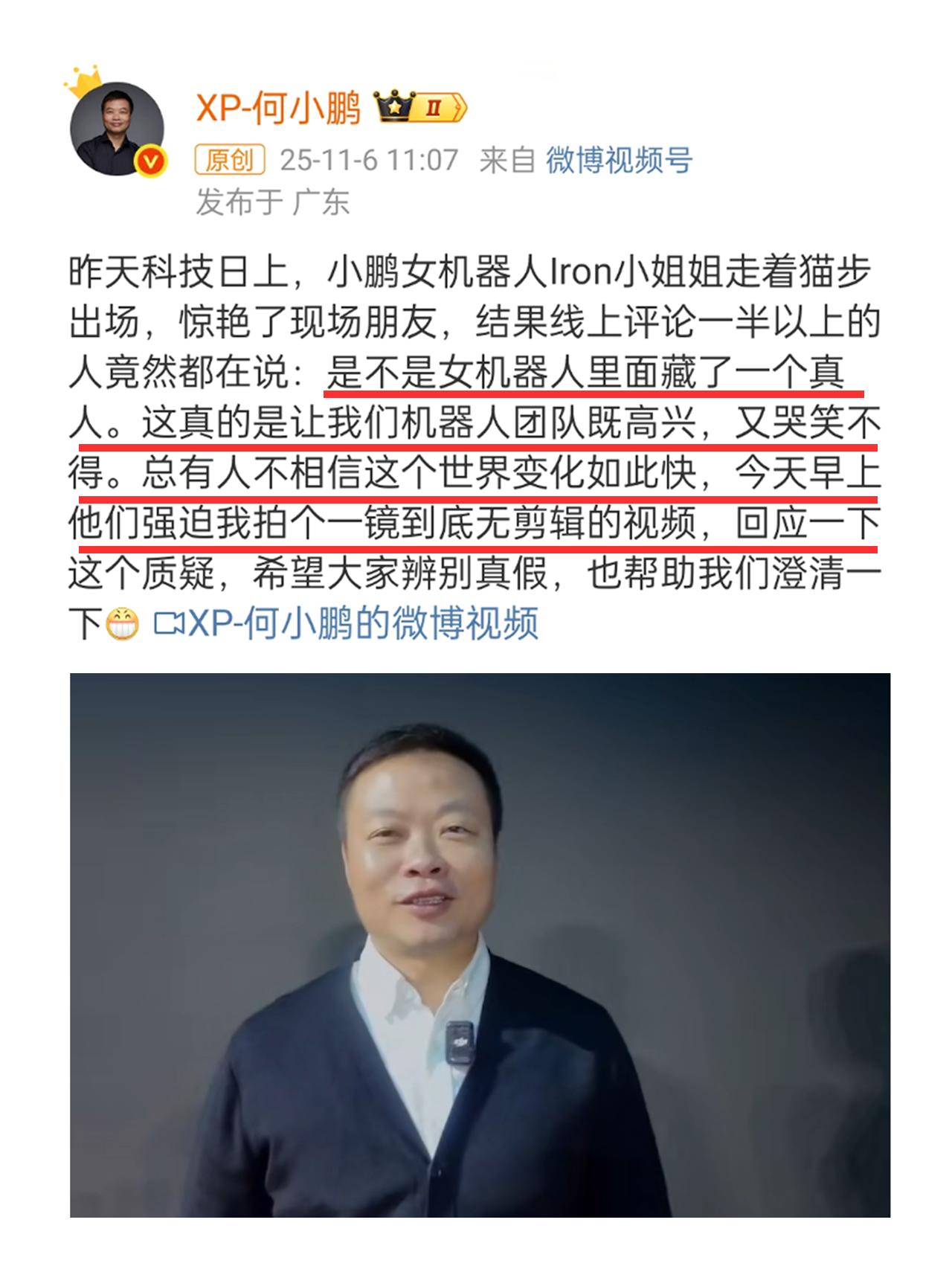 第七届小鹏科技日活动现场,全新人形机器人IRON正式亮相。这款身着银灰色仿生外壳的机器人,凭借流畅度拉满的步态动作迅速引爆网络,却也让不少网友陷入“沉浸式质疑”:这般高度拟人的表现,究竟是硬核黑科技,还是有人藏身其中扮演? 据电子工程专辑等权威渠道报道,IRON机器人在现场完成屈膝、摆臂、踮脚等一系列动作时,关节转动无卡顿感,步态韵律贴合人类行走姿态,甚至能展现出自然的肢体联动效果。有网友放大视频细节提出疑问:“头部可见类似耳朵的凸起”“行走时臀部有肌肉线条联动,衣物褶皱自然,疑似藏人”,更有声音表示“当前行业内人形机器人难达此流畅度,真实性存疑”。 随着争议持续发酵,小鹏汽车董事长何小鹏第一时间下场回应,发布一段无剪辑一镜到底视频自证清白。视频中,IRON完整复刻了活动现场的标志性步态,随后工作人员拉开其背部拉链,内部的机械骨骼支架、电机组件清晰可见,彻底击碎“真人扮演”的传言。何小鹏同步解释,头部的凸起结构实为麦克风阵列,皮肤表层下嵌入仿生肌肉组件,运行时的电机运转声,也是其为机械驱动的核心佐证。 为进一步打消公众疑虑,小鹏在后续技术专场发布会上,现场剪开IRON的小腿覆盖层。在通电状态下,这款机器人依旧能正常行走,机械传动结构直观呈现。 据悉,IRON机器人背后是小鹏团队长达7年的技术攻坚,全身搭载82个自由度,计划于2026年底启动规模化量产。这场争议的背后,既源于技术突破超出大众固有认知,也从侧面印证了国内人形机器人领域的技术进阶。