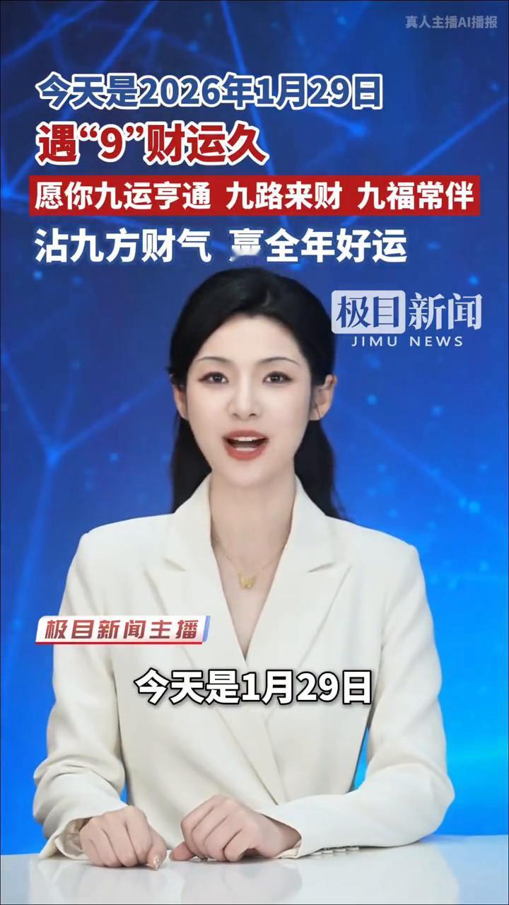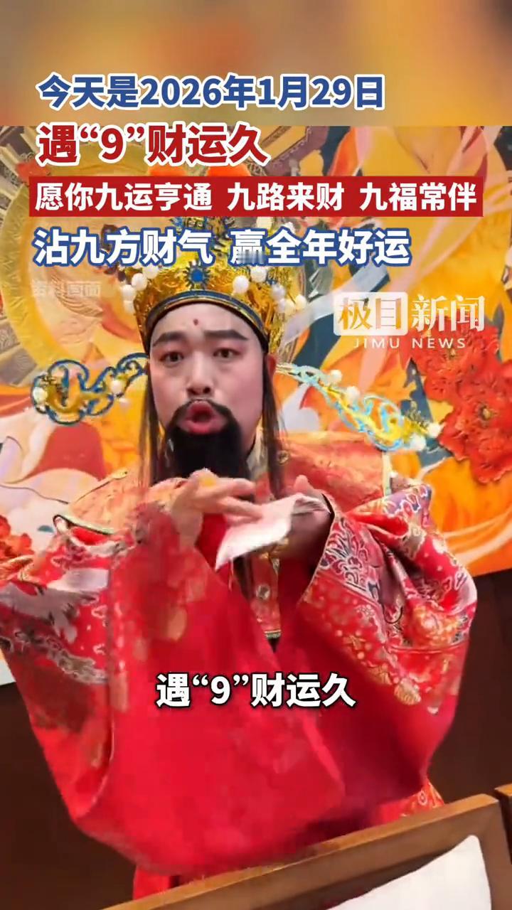 遇"9"财运久,愿你九运亨通、九路来财、九福常伴,沾九方财气赢全年好运。 极目新闻主播彭柳刘。 快接住今天的财运。今天是1月29日,距除夕还有19天,遇"9"财运久。这是一个自带财运的日子,愿你天天发大财,数钱数到手抽筋。九运亨通事事顺,九路财神来送宝,九福常伴添喜气。九禄盈门聚祥瑞,祝你日日进财事事顺,步步登高节节旺,福禄财神全临门。沾九方财气,赢全年好运。