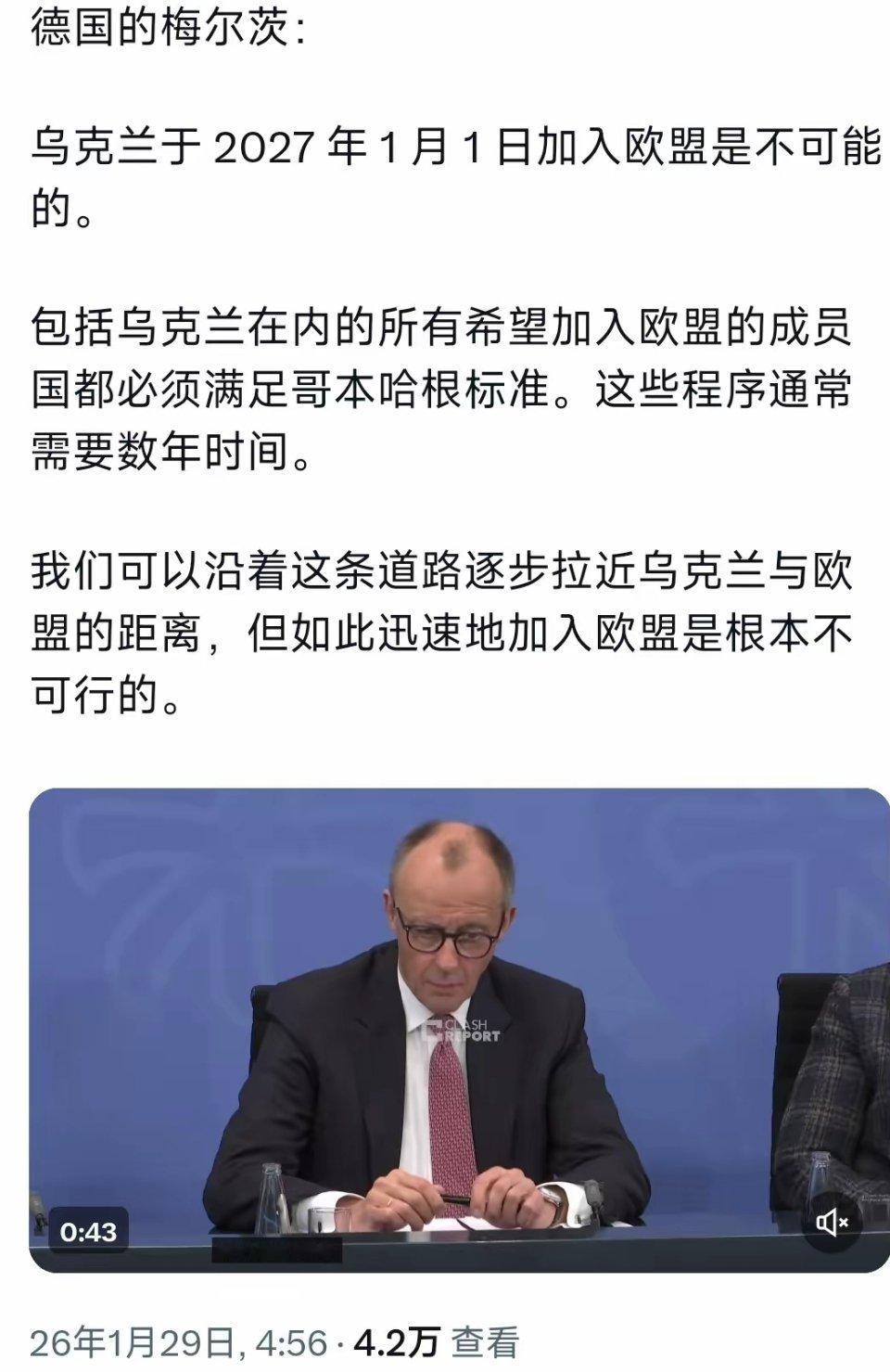 德国总理默茨:“乌克兰于2027年1月1日加入欧盟是不可能的。包括乌克兰在内的所有希望加入欧盟的成员国都必须满足哥本哈根标准。这些程序通常需要数年时间。我们可以沿着这条道路逐步拉近乌克兰与欧盟的距离,但如此迅速地加入欧盟是根本不可行的。”这不是耍人家小泽玩呢吗?
