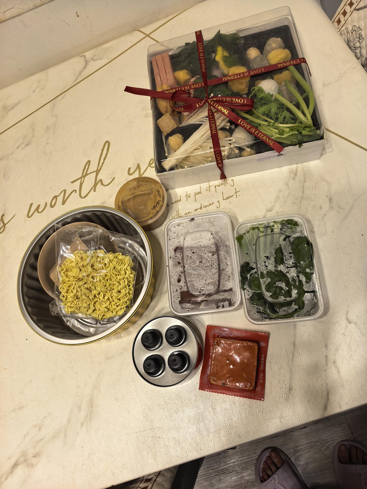 救命!这是我近期点过最满意的外卖! 收到的时候所有食材都用冰袋保鲜,绿油油的青菜、滑溜溜的鸭血、筋道的面饼,还有灵魂麻酱和火锅底料,整整齐齐码在盒子里,看着就超有食欲! 按照说明煮完,汤底又香又浓,麻酱的醇厚和火锅底料的香辣完美融合,方便面吸饱了汤汁,每一口都超级过瘾!鸭血嫩到咬开爆汁,青菜也保持了脆爽的口感。 一个人在家花十几分钟就能吃到堪比店里的麻辣烫,性价比直接拉满!必须给老板点个大赞,已经加入我的无限回购清单了!👍