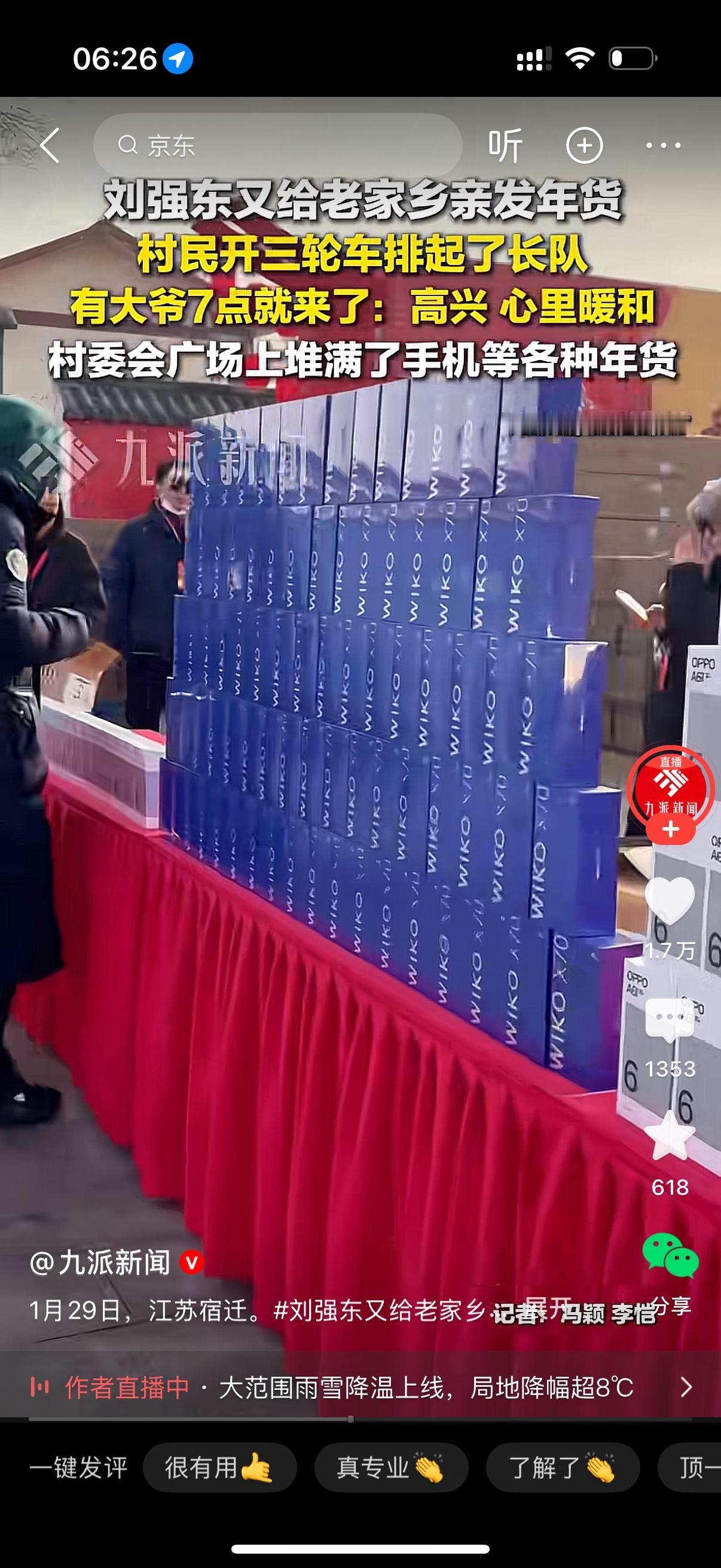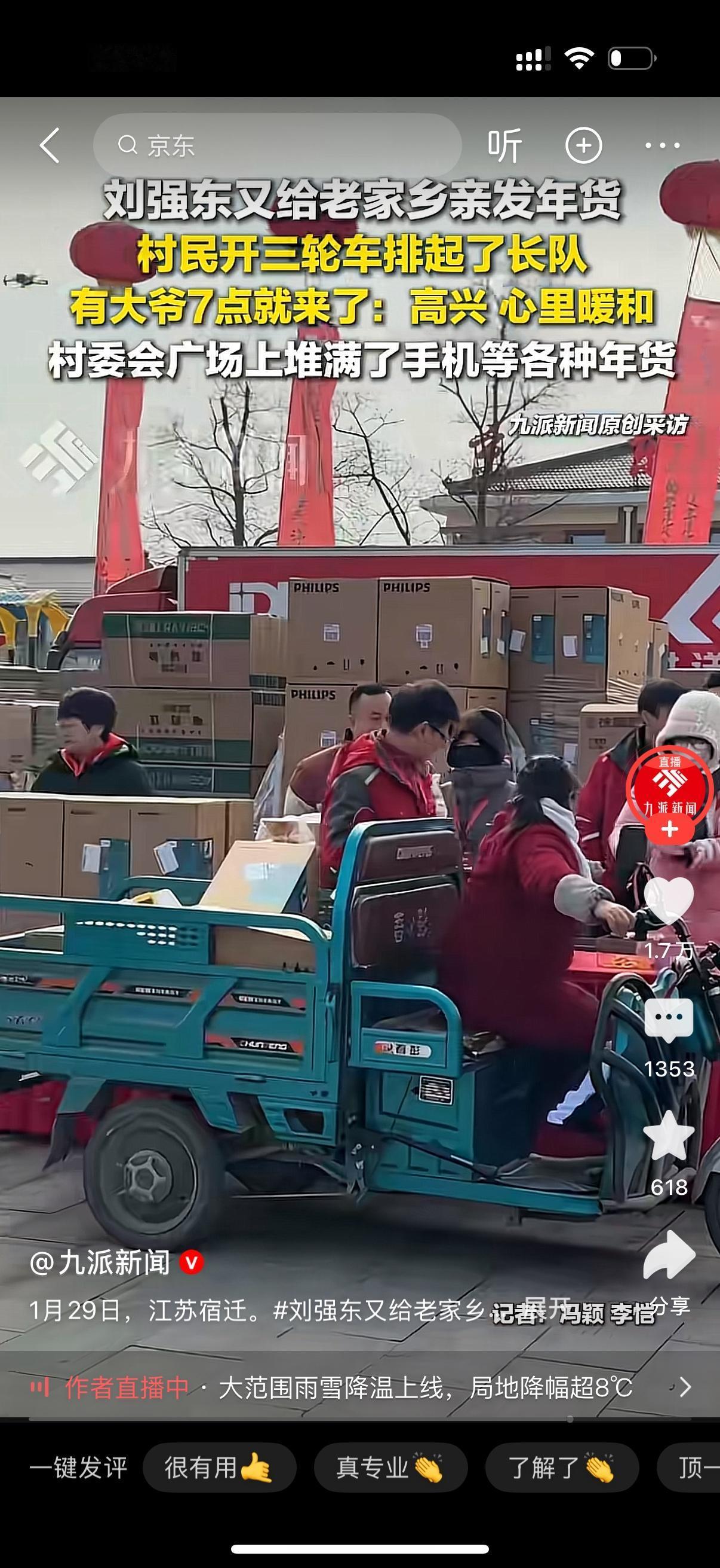 刘强东又开始给老家乡亲发年货。村民开三轮车排起了长队。很多人早上7点就到了。大爷坦言,高兴,心里暖和。村委会广场上堆满了手机等各种年货。刘强东这是反哺当初上大学时村民的鸡蛋之恩。知恩图报的大东子好样的。