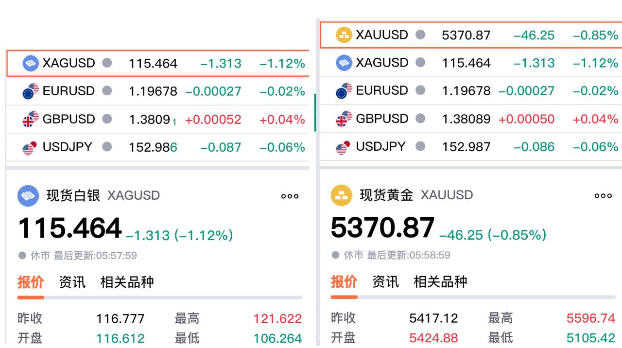 市场给大家上了一场“教育课”, 这几天金价一直疯狂上涨, 都有点无理由的涨,十分的疯狂。 一边是投资大佬提示风险, 一边是老大娘都可以讨论黄金。 昨晚就迎来一场狂风暴雨, 特别是晚上22:30--00:30, 黄金和白银大幅回落。 现货黄金最低跌至5105美元, 白银跌至106.624美元(盘中跌幅8%以上)。 让投资者深刻理解了, 金融市场的一个谚语 没有只涨不跌的市场VS有暴涨就有暴跌。