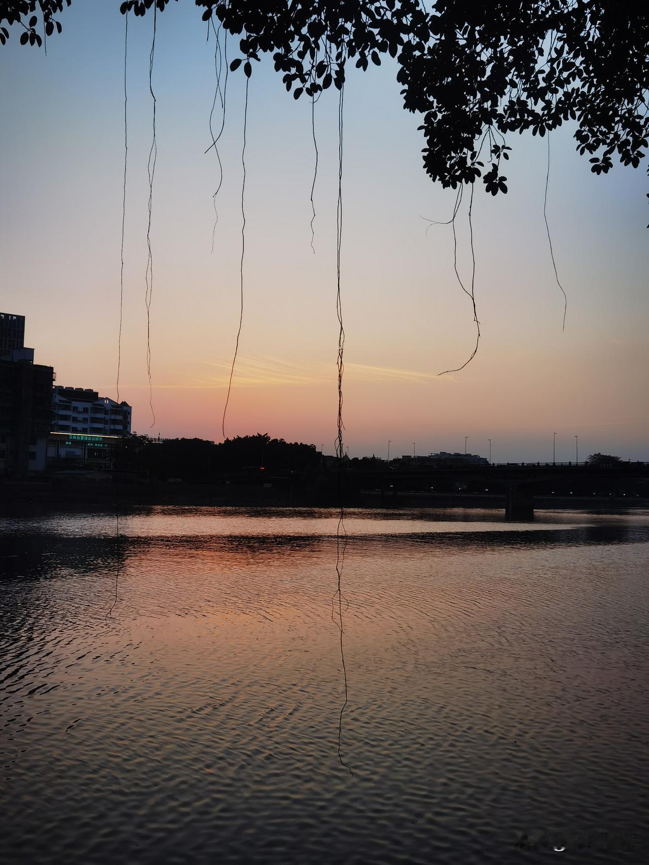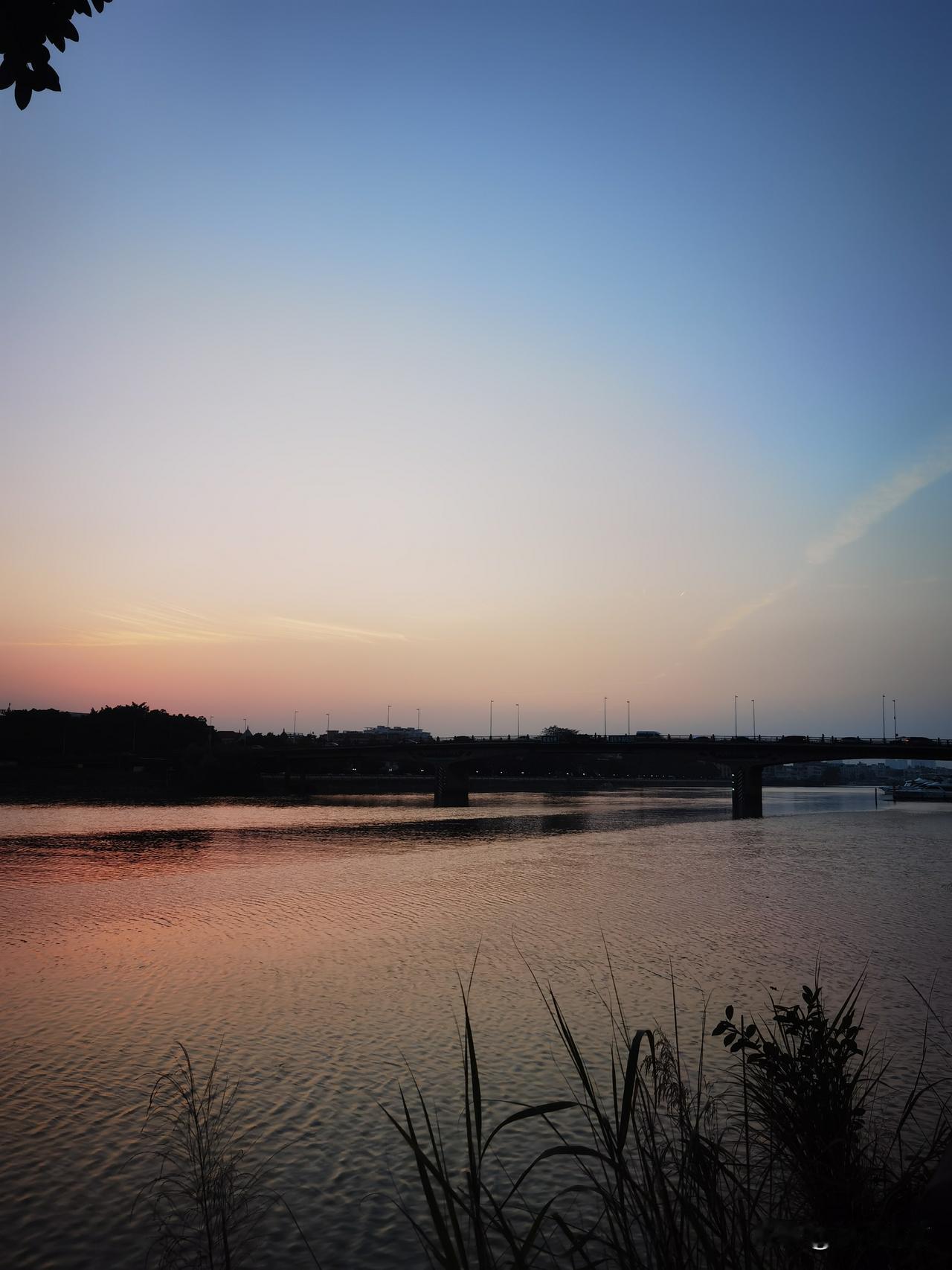 落日黄昏,江畔风景让人忍不住停下脚步,赶紧拿手机拍下如此美的画面,江水微风下泛起点波浪,看到江水中间的分界面了吗?似条长龙,水天相映,甚美,手机随手拍也是一种乐趣,留住美好,分享快乐![送心]
