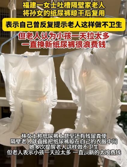 “好心办坏事!”福建,一女子发现隔壁老人,总是把孙女用过的纸尿裤晒干后再次使用,她好心提醒老人这样不卫生,谁知,老人却说太阳能消毒,没事,之后又说了一句话让女子心里很不是滋味。 福建,林女士抱着刚洗好的床单被罩往天台走,想着让阳光把潮气都晒走,可刚走到天台的晾衣区,眼前的一幕就让她愣在了原地。 天台的晾衣绳被拉得整整齐齐,隔壁李奶奶的晾衣架上,除了挂着老人的灰色秋衣和小孙女的纯棉小外套,还有几片被抻得平平整整的纸尿裤,起初林女士以为是老人提前买好的新纸尿裤拿出来晒一晒。 可走近了才发现,这些纸尿裤的表层能看到淡淡的痕迹,凑近了还能闻到一点不易察觉的异味,她这才猛然反应过来,这哪里是新的,分明是孩子用过的纸尿裤,被李奶奶拿来晒干了。 林女士和李奶奶做邻居快两年了,对这位老人的情况也算了解,李奶奶是从老家来城里帮儿子儿媳带孩子的,小孙女才出生一个多月。 儿子儿媳在附近上班,每天都是早出晚归,家里照顾孩子、操持家务的活,全靠李奶奶一个人忙活。平时在小区里碰到,总能看见李奶奶抱着小孙女,孩子的小脸蛋被擦得干干净净。 任谁看了都觉得,李奶奶是个对孩子格外细心的老人,所以看到老人晒用过的纸尿裤这一幕,王女士的心里满是诧异,怎么也想不通,对孩子这么好的老人,会做这样的事。 而这并不是偶然,在那之后的几天,只要天气晴好,林女士总能在李奶奶家的阳台护栏上,或是天台的晾衣架上,看到被平铺晾晒的纸尿裤,有时候是一片,有时候是两三片。 李奶奶还会时不时走到阳台,用手扯一扯纸尿裤的边角,让它能被阳光晒得更透彻,甚至会把纸尿裤翻个面,让原本贴在里面的那一面也露在阳光下。 林女士看在眼里,心里却揪得慌,她知道新生儿的皮肤比纸还薄,抵抗力更是弱得很,用过的纸尿裤里会残留尿液和粪便,里面的细菌根本不是靠阳光晒一晒就能消灭的。 更何况李奶奶还把这些纸尿裤和全家人的干净衣服挂在一起,那些看不见的细菌,很可能会沾到衣服上,想想都觉得不卫生。 纠结了两天,林女士终于找了个合适的时机,某天她又跟李奶奶在晾晒区碰面的时候,她轻声跟李奶奶说。 纸尿裤都是一次性的,用过的再晒了用,怕是不太卫生,孩子这么小,万一因此闹了毛病,那多遭罪。 没想到李奶奶听了这话,只是抬头看了看林女士,摆了摆手笑着说没事,她指着头顶的太阳,声音洪亮地说,这大太阳晒着,啥细菌不得被晒死啊。 太阳能消毒,比那些花钱买的消毒水还管用,还说自己老家的那些孩子,以前用的布尿布,不都是洗一洗、晒一晒就反复用,一个个不也都健健康康长大了,哪有那么多讲究。 林女士还想再劝几句,跟老人说一次性纸尿裤和布尿布不一样,里面的吸水层用过之后就坏了,再晒也恢复不了,还藏细菌,可李奶奶却摆摆手,打断了她的话。 说小孙女太小了,肠胃还没长好,一天到晚要拉好几次,有时候刚给孩子换上一片新的纸尿裤,没半个小时就脏了,又得赶紧换,有时候刚换好,孩子又尿了。 一天下来,光是纸尿裤就得用七八片。李奶奶说,这纸尿裤看着薄薄的一片,买起来可不便宜,便宜的怕质量不好,不敢给孩子用。 稍微好一点的,一片就要一块多,好点的接近两块,这么算下来,一包纸尿裤没几天就用完了,一个月光买纸尿裤,就得花好几百块,实在是太费钱了。 她知道自己的提醒是好心,可此刻却觉得这份好心,似乎显得有些多余,她不知道自己该不该再继续劝说,也不知道该用什么样的方式,既能提醒老人注意孩子的卫生,又不会让老人觉得心里不舒服。 把用过的纸尿裤反复晾晒后给孩子用,对低龄宝宝尤其是新生儿的伤害是实打实的,远不是 “太阳晒一晒就能消毒” 那么简单,宝宝的皮肤屏障和免疫系统都没发育成熟,再加上一次性纸尿裤本身的结构特性,这么做会直接引发一系列健康问题。 用过的纸尿裤里会残留大肠杆菌、沙门氏菌,还有轮状病毒、诺如病毒这些肉眼看不见的致病菌,太阳暴晒的温度顶多五六十℃,根本达不到医用消毒的标准,只能杀死表层一点点细菌,深层的致病菌依旧存活。 宝宝天生爱抓挠,小手碰到纸尿裤上的致病菌,再下意识地吃手、抓东西往嘴里放,致病菌就会直接进入宝宝的肠道,新生儿的肠道菌群还没建立起来,根本扛不住这些细菌的侵袭,很快会出现腹泻、呕吐、腹痛的情况。 反复用晾晒的纸尿裤,看似是为了省那几块钱的小算计,实则是拿孩子的健康当赌注,尤其是新生儿,本身抵抗力就弱,一丁点的细菌都可能引发严重的问题,到头来不仅省不了钱,还会让孩子遭罪,家长也跟着受累,完全得不偿失。 对于这件事,您有什么想说的吗?欢迎评论区留言讨论。 信源:中国蓝新闻2026-01-27——《近日福建林女士吐嘈隔壁家老人曾多次将孙女的纸尿裤仅晾干后复用。老人将该还残有排泄物的纸尿裤晾在林女士衣服中间。》