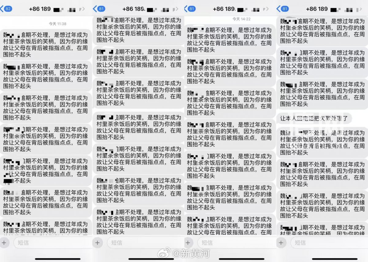 1月26日中午11:38,信号新闻采访用的手机上突然收到了189手机号发来的短信,内容为“魏某某逾期不处理,是想过年成为村里茶余饭后的笑柄,因为你的缘故让父母在背后被指指点点,在周围抬不起头”。更让人没想到的是,在2分钟内,有17条一模一样的短信连续发到了信号新闻的采访手机上。而这些短信稍作暂停后,又开始了新一轮骚扰,到11时55分时,手机共收到了34条催收短信。