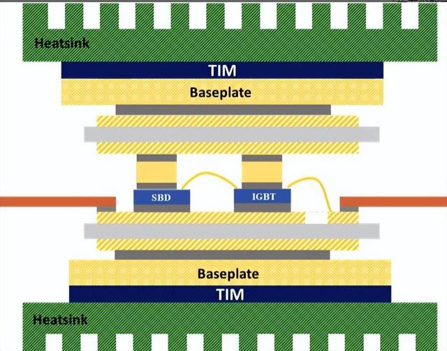 以摆脱作为互连方法的线键合,引入替代互连技术,功率半导体器件通过焊料或烧结直接连接到铜导体上,以便热量可以通过功率半导体器件的两侧消散和传递。由于消除了线键,功率半导体器件顶部的附加路径使两条平行冷却路径成为可能,从而形成双面冷却功率模块,近几年对功率模块双面冷却的研究也越来越多。和单面结构散热结构相比,双面冷却结构在功率芯片的两侧均焊接有绝缘导热基板,功率端子全部与绝缘导热基板相连,绝缘导热基板的外侧安装有散热器。这种设计可以提供更好的传热,并大大降低有效温度。理论上,双面冷却可使装置与冷却剂之间的Rth降低50%。与单面冷却电源模块相比,双面冷却功率模块的优势包括: