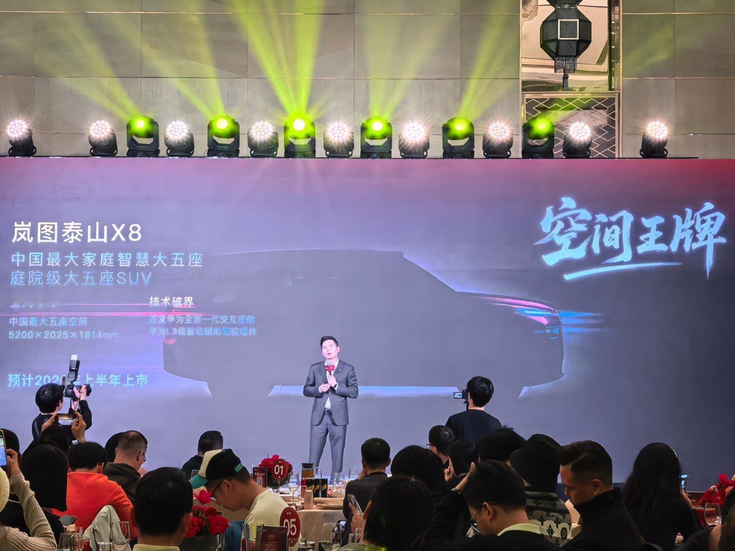 2、岚图泰山X8,这个就有意思了,一个长度5米2的的大五座SUV,估计后排能当客厅用了。而且预告称它会首发华为全新一代交互座舱。上市时间在2026年上半年。