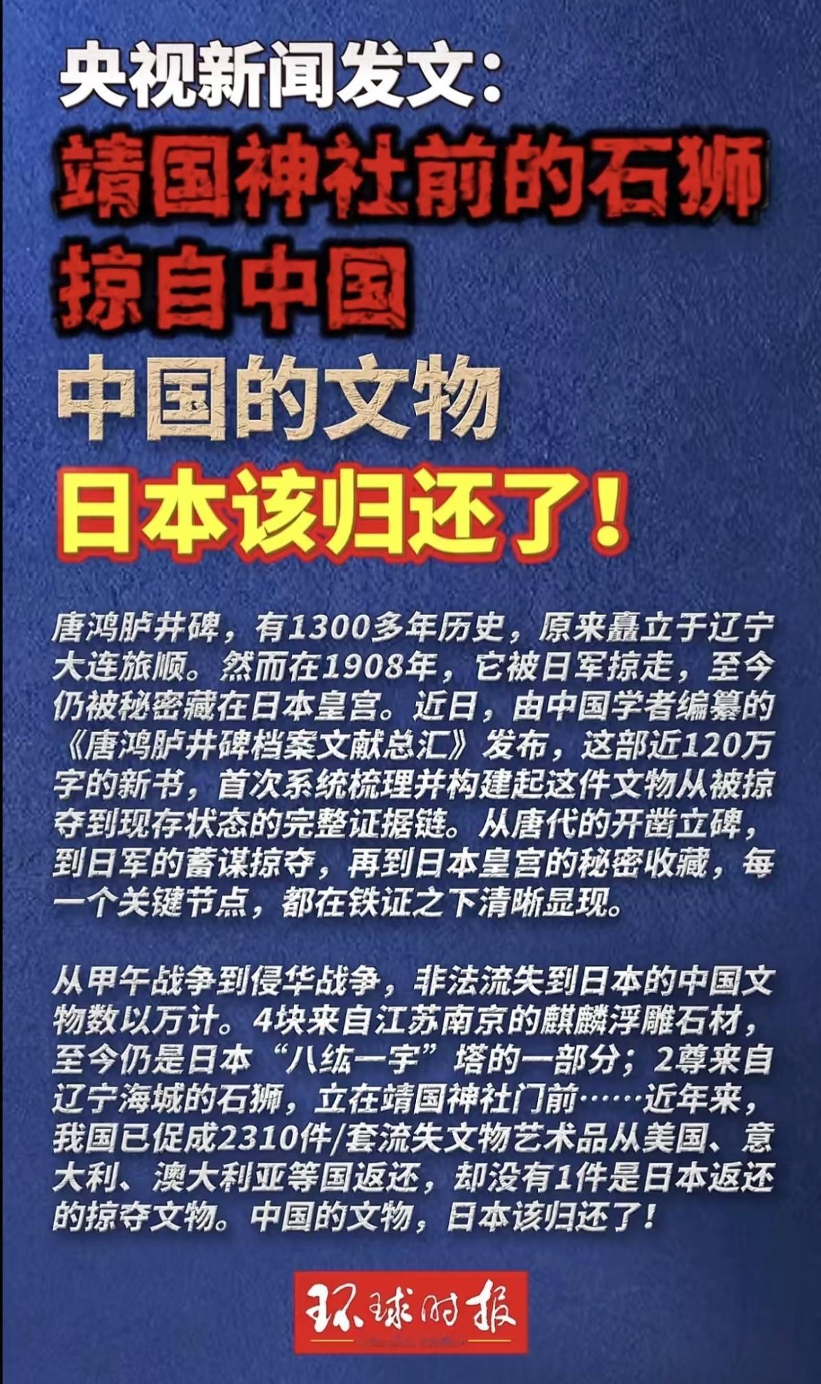 中国正限期日本归还被抢百年的唐鸿胪井碑。这件事不是简单的文物讨要,是一个民族对历史主权的坚定捍卫,是对百年前掠夺行径的正当追责,每一个细节都藏着不容撼动的真相。 唐鸿胪井碑立在唐朝开元二年。彼时唐玄宗下旨,让鸿胪卿崔忻远赴辽东册封渤海郡王,为记录这一历史时刻,专门立下此碑。碑身仅刻二十九个字,这二十九个字却字字千钧,直接佐证着中国对辽东地区的主权管辖,是实打实的历史铁证。千余年间,石碑静静矗立在辽宁大连旅顺黄金山,清朝时期还专门修建碑亭,用心守护这件国宝,石碑也成了当地历史的一部分,默默见证着岁月变迁。 日军在20世纪初占领旅顺。他们发现了唐鸿胪井碑的历史价值,便起了掠夺之心,行事毫无章法可言,直接动用重型机械拆解保护石碑的碑亭,将亭体拆成十八块构件,又把数吨重的石碑强行切割,整套动作粗暴至极。随后日军将石碑和碑亭构件搬上军舰,一路运回日本,整个过程没有任何正当手续,就是一场明目张胆的掠夺。日军还将这块抢来的石碑献给日本天皇,将赃物美其名曰“战利品”,此后石碑便被锁在日本皇宫建安府,极少有人能见到其真容。 中国从未放弃对唐鸿胪井碑的追索。上世纪九十年代,国内专家就率先发声,呼吁日方归还石碑,后续国家层面将其列为重点追索的文物对象。2014年,中国民间组织正式致信日本皇室,提出归还诉求,字字句句都是对文物回归的期盼。近几年,日本国内也涌现出正义之声,“中国文物返还运动推进会”这类组织在当地发起签名请愿,越来越多的日本民众意识到,霸占别国文物是违背文明的行为,根本站不住脚。 日方对石碑的归属始终百般狡辩。他们一会称石碑在日本存放百年,已是“皇室财产”,一会又谎称清末中国混乱,石碑是“中方赠送”,甚至搬出所谓“国际法时效”妄图搪塞。这些说辞毫无依据,中国留存着全套详实证据,日军当年留下的《战利品寄赠书类》、石碑搬运清单、港口出入记录全都完好保存,谁切割、谁运输、谁交接,整个过程清晰可查,铁证之下,日方的所有狡辩都不攻自破。 国际法早已明确界定相关准则。1970年联合国教科文组织通过的公约中,清晰写明战争期间掠夺的文物,必须归还原属国,日本作为缔约国,签字认可了这一准则,却始终无视公约要求,霸占文物拒不归还。世界范围内,文物追索已成大势,希腊向英国索要帕特农神庙石雕,埃及在全球搜寻被盗文物,意大利通过法律手段追回流失文物,没有任何一个国家,能将掠夺的文物据为己有。 2026年1月,中国发布《唐鸿胪井碑档案文献总汇》。这份资料系统梳理了石碑从立碑到被掠夺,再到如今被日方藏匿的全部历程,交接备忘录、搬运单据、现场影像等资料一应俱全,为追索工作提供了更坚实的依据。同月中旬,中国向日本发出外交照会,给出六个月的限期,要求日方无条件归还唐鸿胪井碑在内的十八件珍贵文物,若日方拒不执行,中方将启动国际仲裁程序。 日方内部对此事的态度各有分歧。日本文部科学省表示可以商谈,宫内厅却依旧坚持石碑是“皇室世产”,外务省则担忧事件升级,影响两国关系。与此同时,中国民间也用实际行动支持文物追索,2026年1月中国大陆飞日本的航班取消率飙升至四十七点二,四十九条航线直接撤销了二月份的全部班次,外交部也发布了赴日旅行提醒,民间的自发抵制,成了文物追索的坚实后盾。 国力的提升,让中国的文物追索更有底气。百年前,国力孱弱,面对文物被抢,我们只能口头谴责,日方全然无视;如今的中国,有足够的实力、足够的法理依据,向世界表明立场,任何国家都不能将掠夺的文物据为己有,任何试图歪曲历史、掩盖掠夺行径的行为,都注定会失败。唐鸿胪井碑的追索,只是一个开始,所有被列强掠夺的中国文物,我们都会一件件讨要回来,这是对历史的尊重,是对民族尊严的捍卫,更是一个民族崛起的必然。每一件流失的文物,都刻着民族的记忆,每一次追索,都是对历史真相的坚守,这份坚守,从未停歇,也绝不会停歇。 来源 | 环球时报