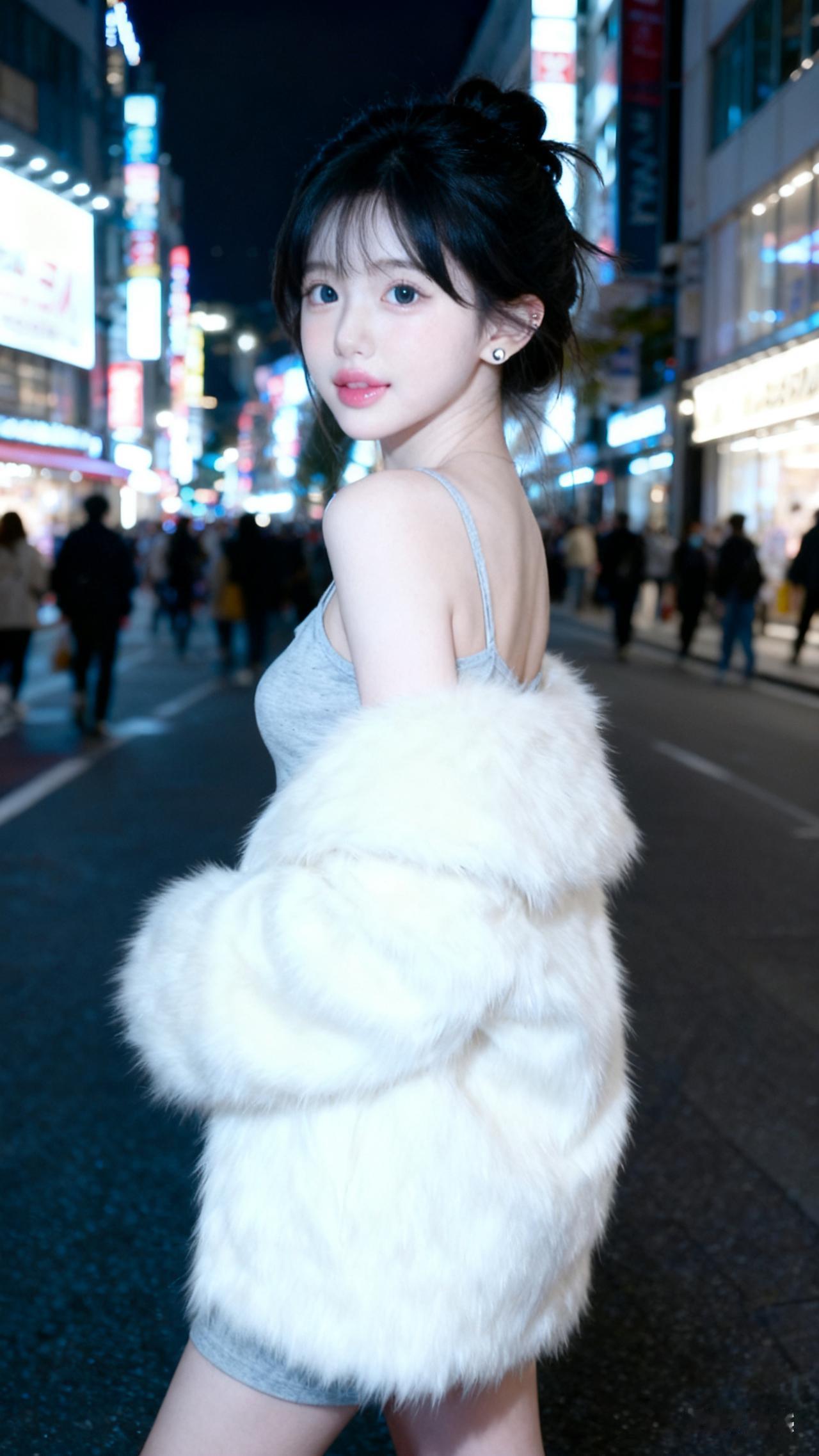 夜晚的都市霓虹,少女在街头漫步,时尚与魅力并存。
