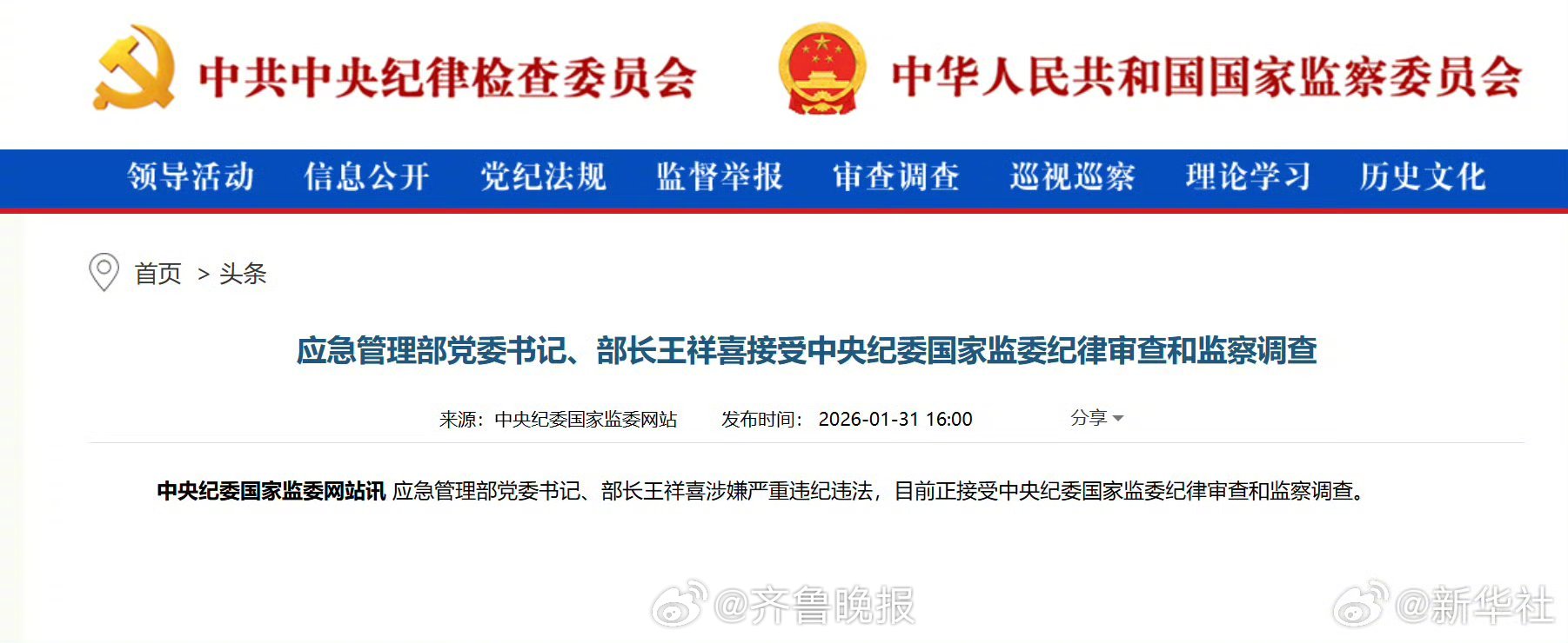 【#应急管理部部长王祥喜被查#】#王祥喜接受审查调查# 应急管理部党委书记、部长王祥喜涉嫌严重违纪违法,目前正接受中央纪委国家监委纪律审查和监察调查。#应急管理部部长被查#(中央纪委国家监委网站)