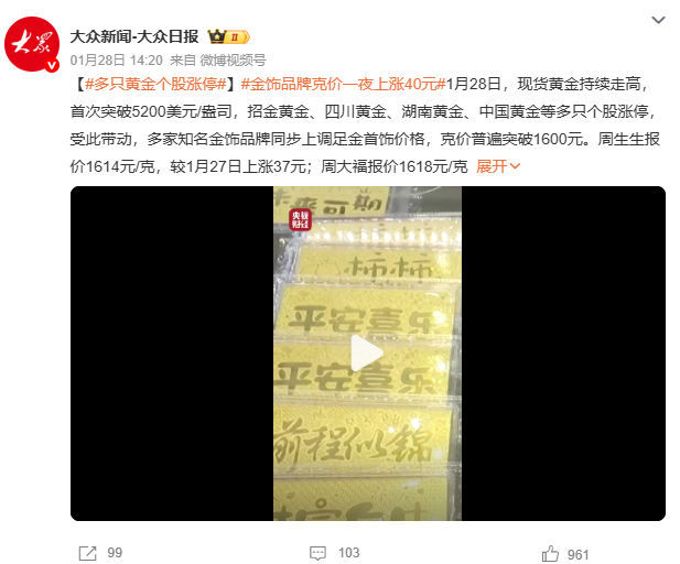 多只黄金个股涨停1月28日的信息,今天上热搜?这个热搜上的是何居心?黄金价格已