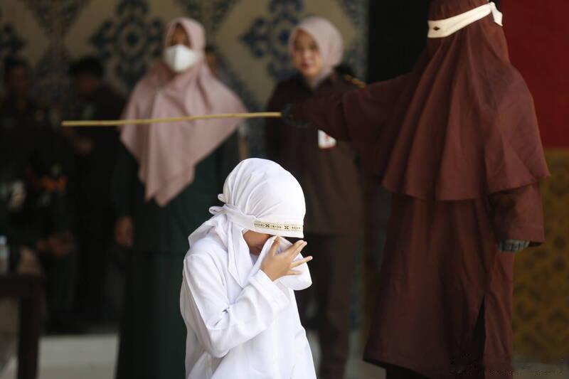 图1:印尼亚齐省一名女子因发生婚外性行为,遭公开鞭打。图为她难忍剧痛与羞辱掩面痛哭;她与男伴当天各被判处惊人的140下鞭刑。 (欧新社)图2:行刑过程中,这名女子体力不支当场晕厥,需由执法人员搀扶急救。 (法新社)