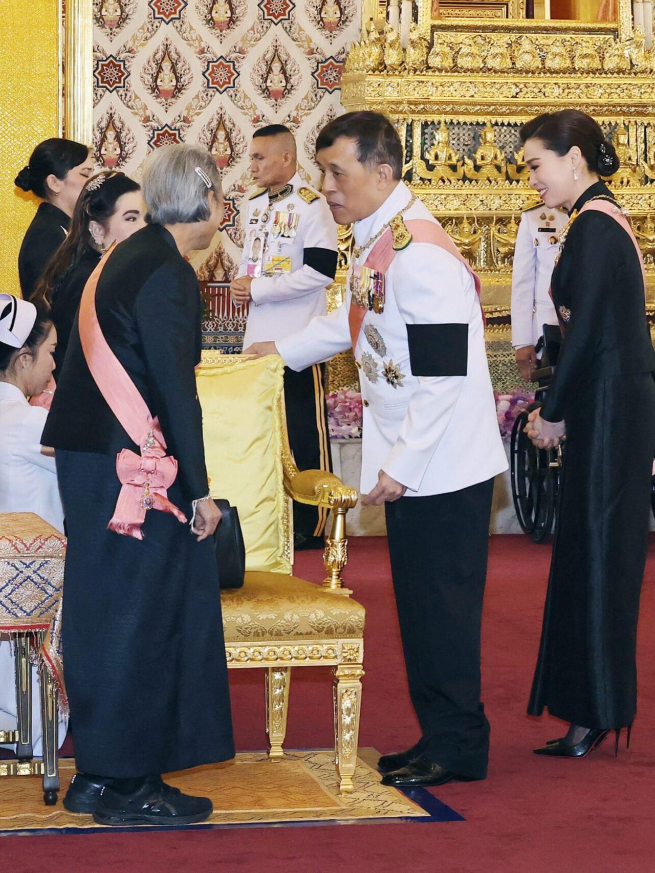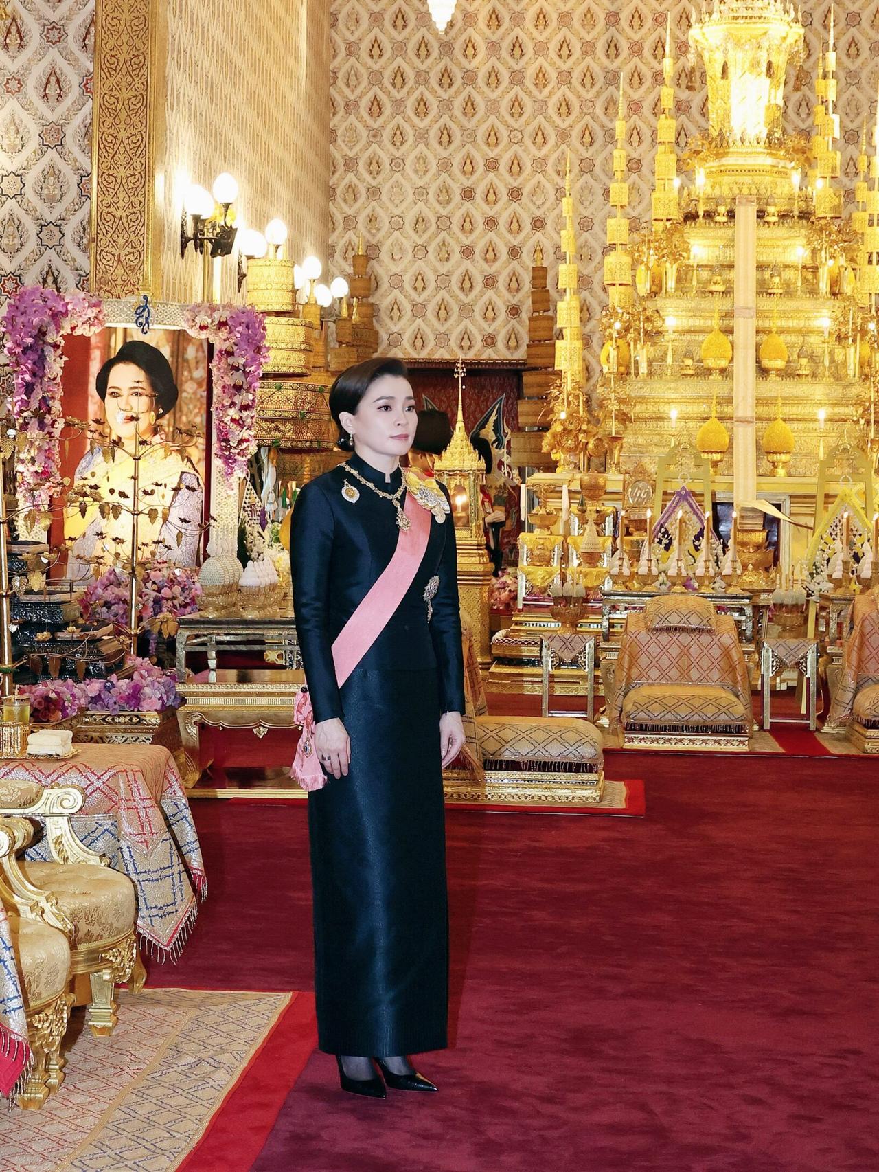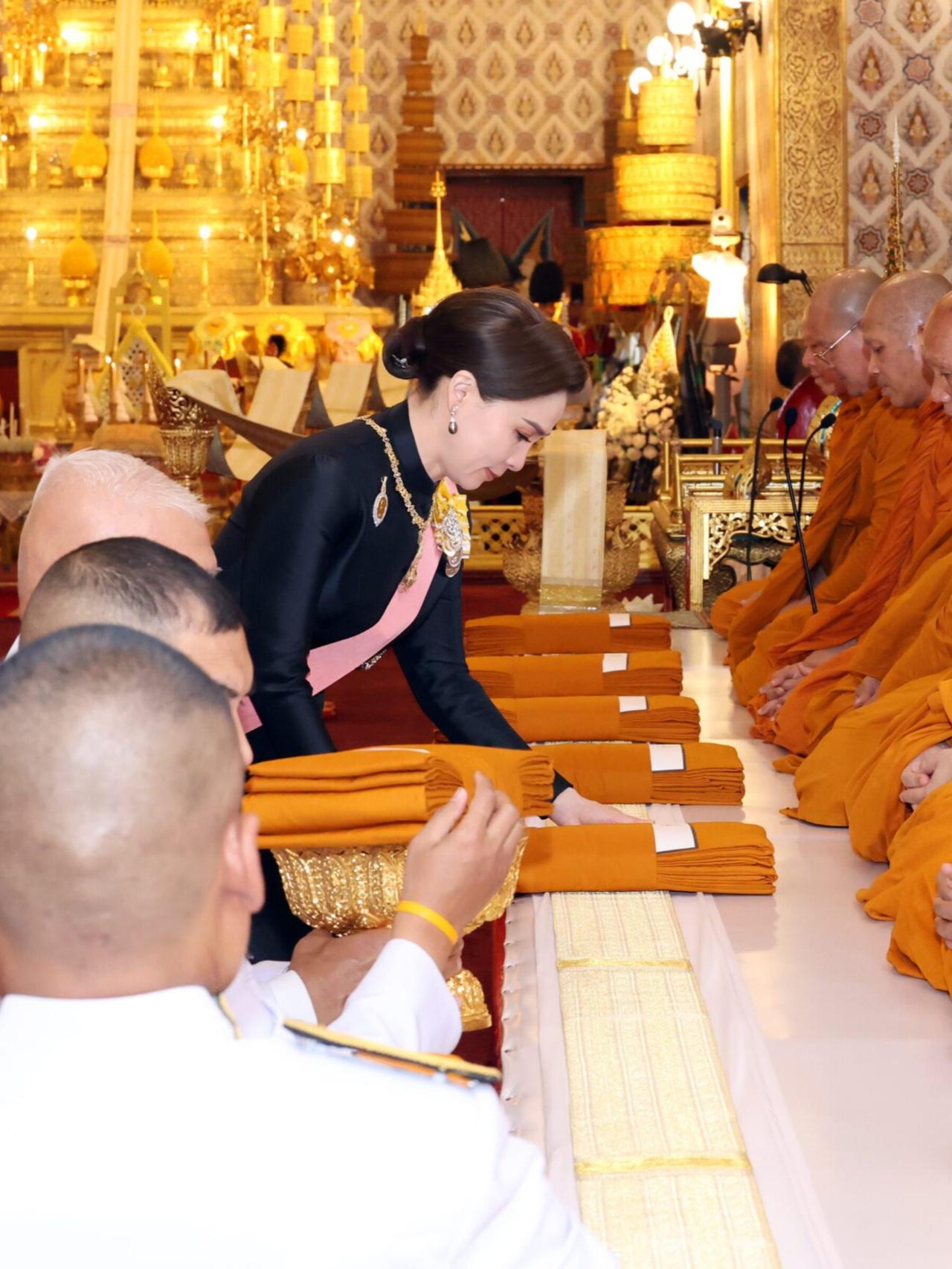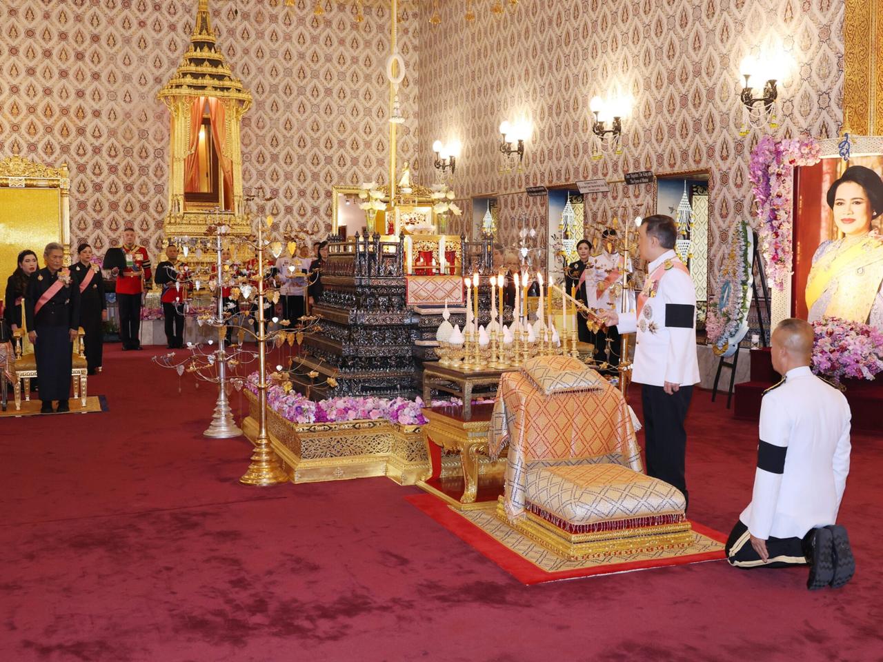 诗丽吉逝世百日追思会,苏提达无疑是女主角 泰王携苏提达王后,乘坐皇家车队前往大皇宫律实玛哈帕萨宫,出席已故诗丽吉王太后逝世百日追思会。此次出行,提帮功和诗妮娜也一同随行,现场氛围庄严肃穆,众人共同缅怀王太后。